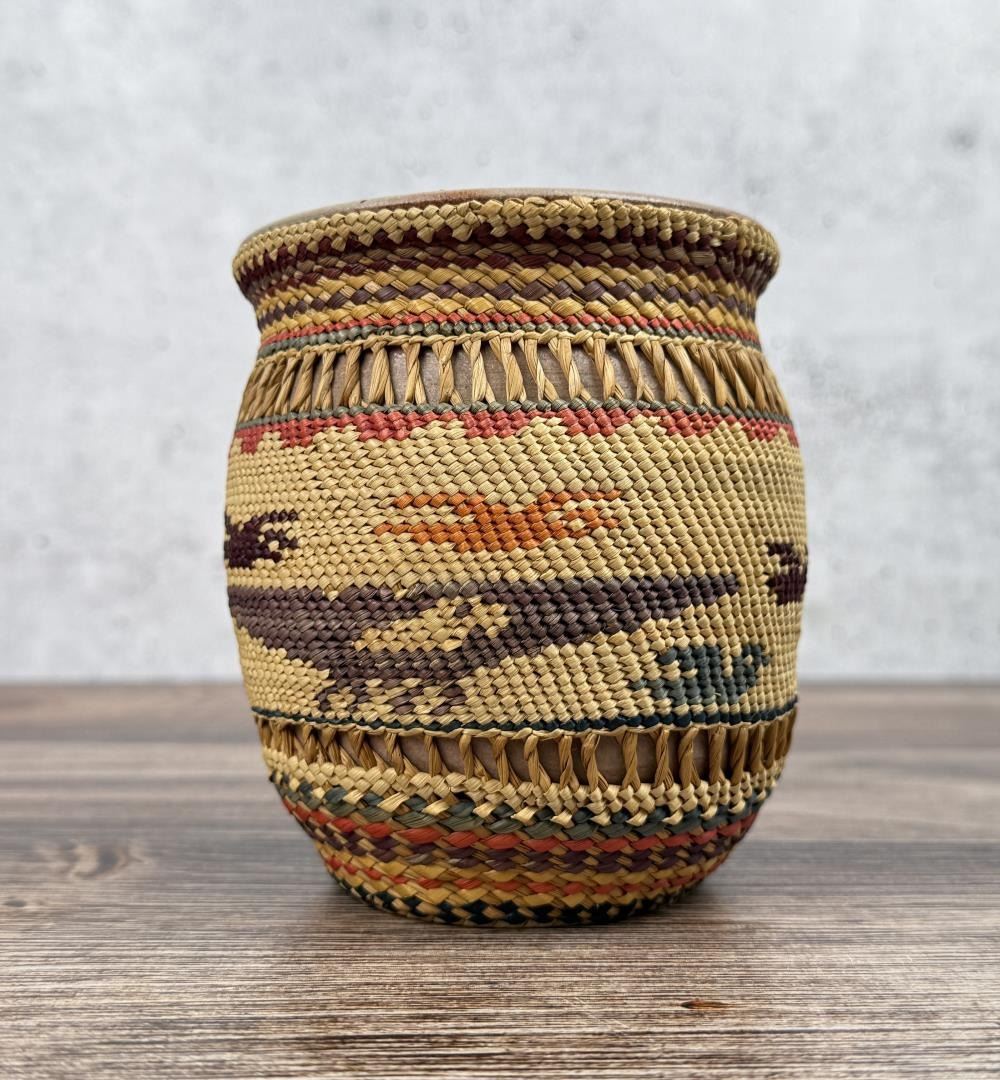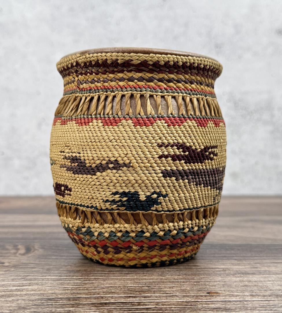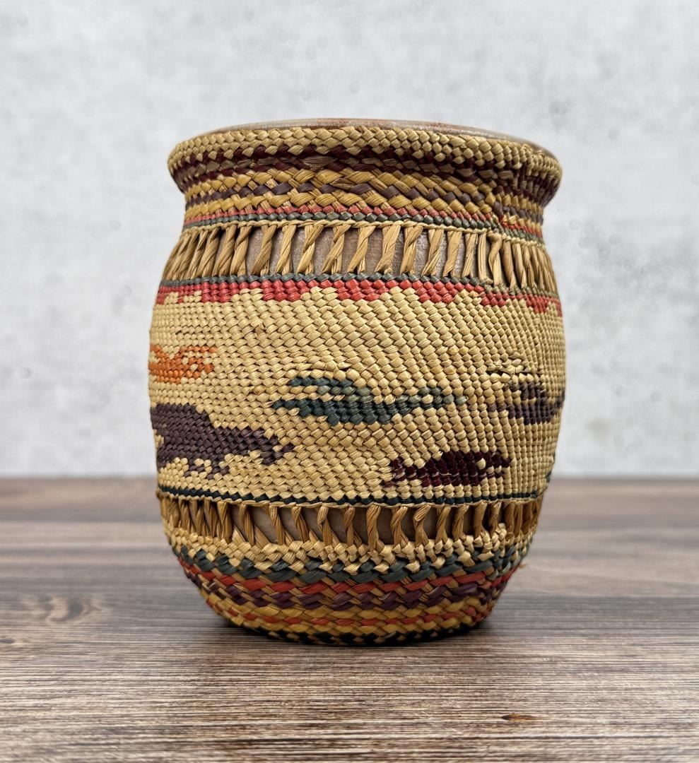 4 5/8" tall, 4 1/8" diameter. Woven over a bean pot.
