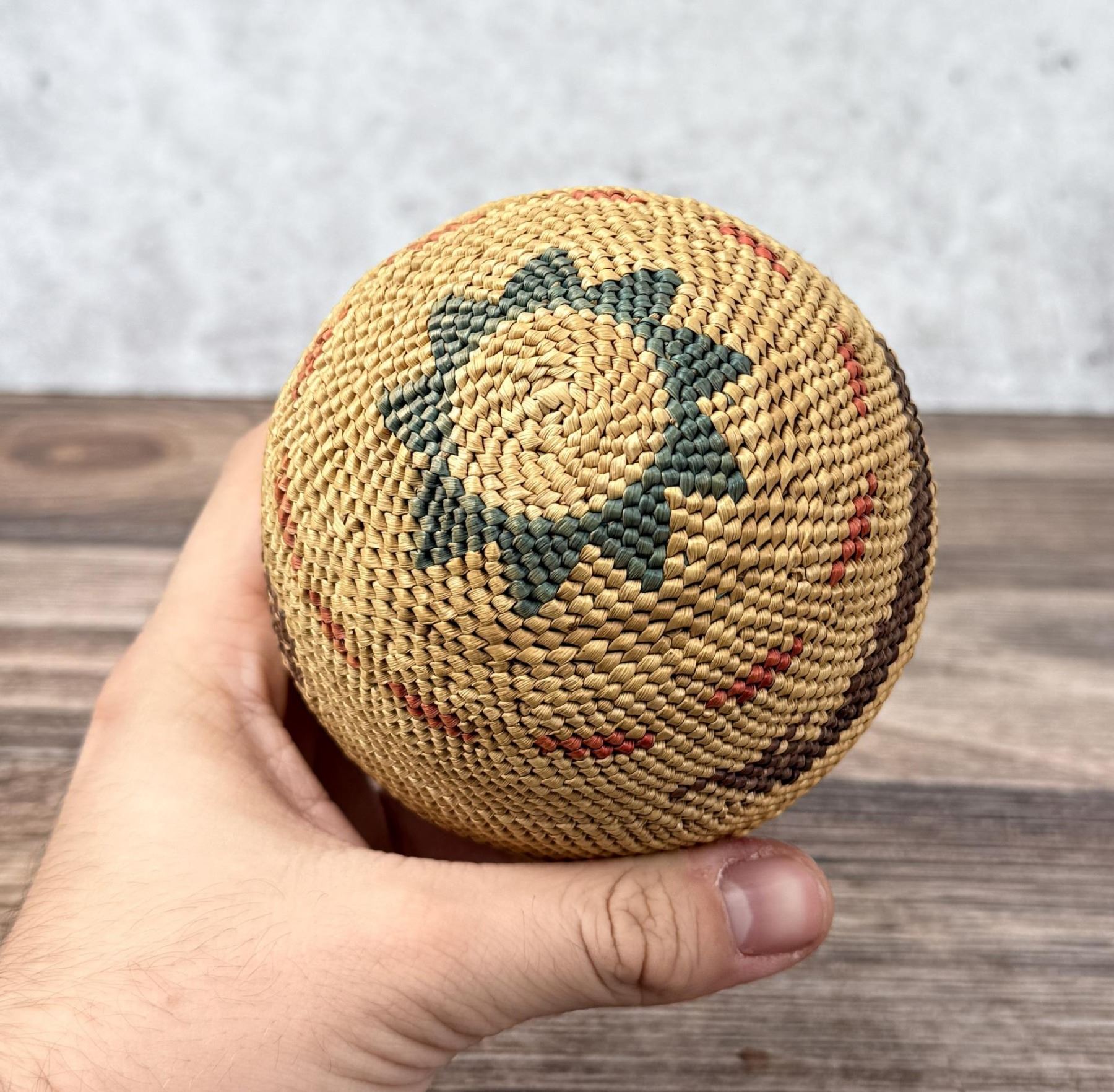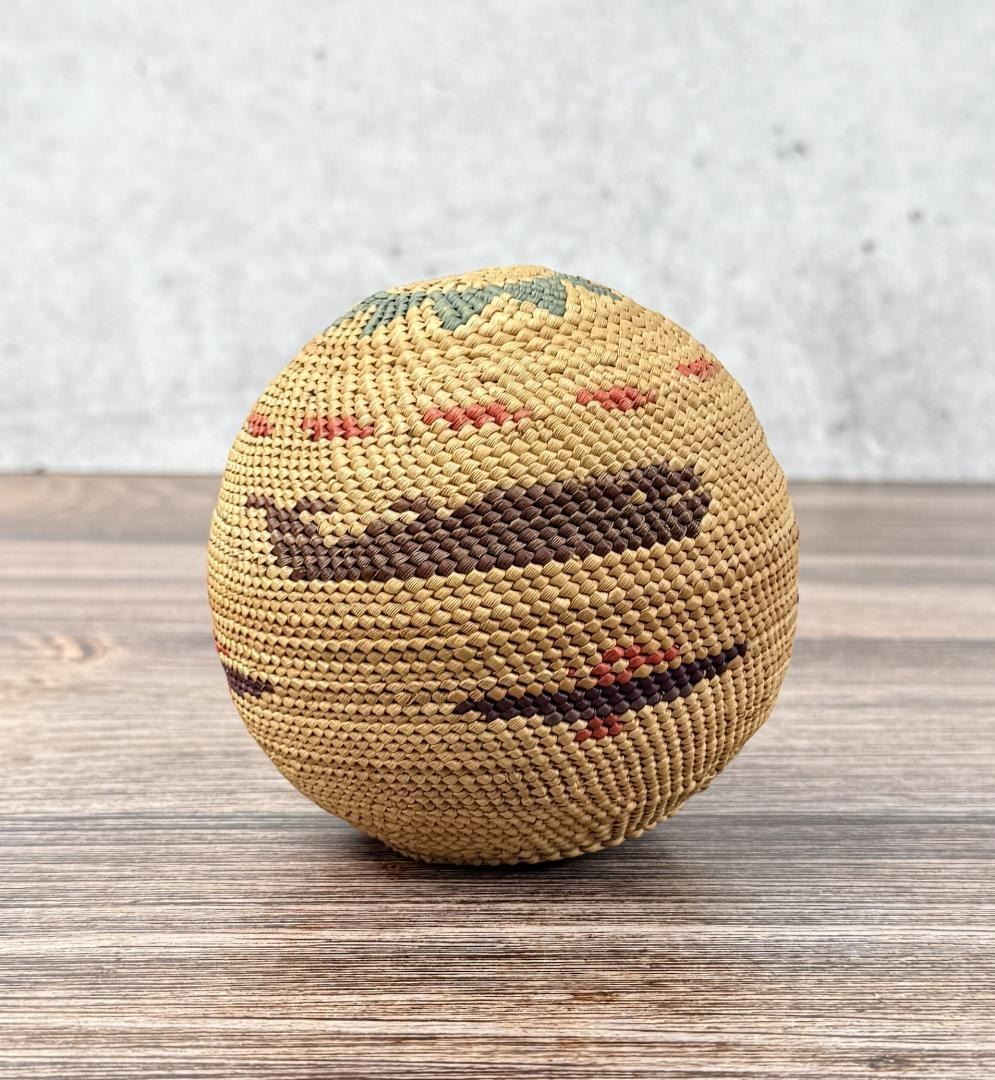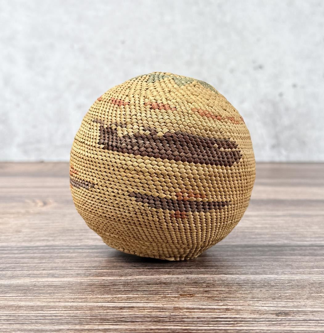 Very unusual, whaling scene basket over blue Japanese glass fishing float. 4 1/8" diameter.