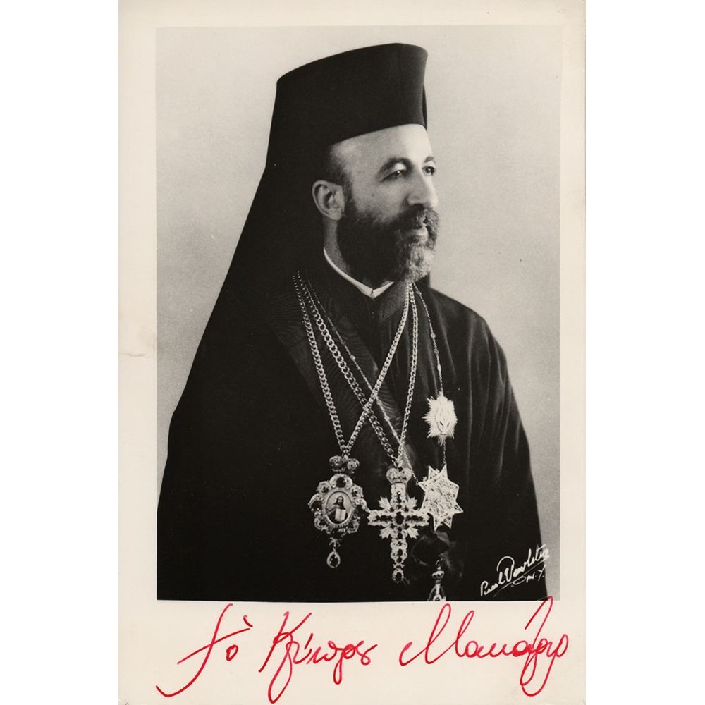 Greek Cypriot clergyman and politician (1913–1977) who became the first president of Cyprus in 1960; during his three terms, he survived four assassination attempts and a coup d'état. Vintage matte-finish 4.75 x 7 photo of Makarios III in his ornate dress, signed in the lower border in red ink. In very good to fine condition, with rippling and creases to the edges.