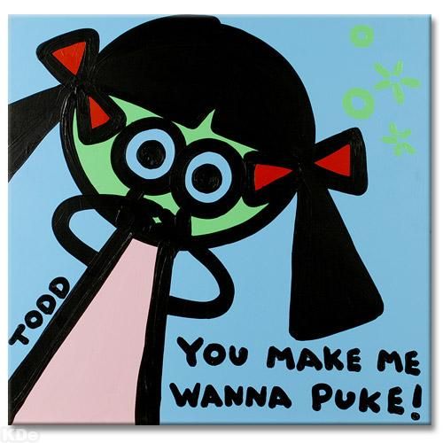 ADD THE IRREVERENT ARTWORK OF WORLD-RENOWNED ARTIST TODD GOLDMAN TO YOUR COLLECTION! Pop artist Todd Goldman is known all across the globe for his whip-smart and wickedly funny puns and pictures! "Make Me Puke" is an original acrylic painting on stretched canvas, hand signed by Goldman. Includes Certificate of Authenticity! Measures approx. 24" x 24" (image).
