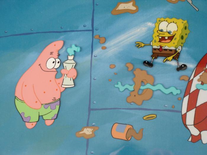 This animation cel and reproduction background are from the Nickelodeon TV show SpongeBob Squarepants. The story takes place under the deep blue sea in Bikini Bottom, where SpongeBob resides. SpongeBob, who is a yellow, porous sponge, is your typical happy-go-lucky character, as he is always cheerful and enjoys making people laugh. Patrick Star, SpongeBob's neighbor who is a starfish, is your average children's show idiot, as he boasts knowing nothing and is often getting himself into ridiculous situations. Between the homes of these two lies the home of the miserable Squidward, a squid, who is known for being grouchy and playing tricks on SpongeBob and Patrick. Both SpongeBob and Squidward work at the Krusty Krab, a fast food business run by the greedy money-loving Mr. Krabs, a crab, the arch rival of the evil, possibly misunderstood, Plankton. Another neighbor, Sandy Cheeks, an athletic squirrel who normally wears an astronaut's space suit, was introduced in "Tea at the Treedome." She spends most of her time inventing and experimenting. Patrick and SpongeBob are making a mess.Original Printed Background and Animated Cel Overall Size of Background: 11" x 17" Overall Size of the Cel: 10 1/2" x 12 1/2" Very good condition This is an original hand-painted cel set-up used in the production of an episode of "SpongeBob SquarePants." Each one-of-a-kind set-up represents a slight change in position of the characters. When individually photographed and projected in rapid succession, the images appear to move.