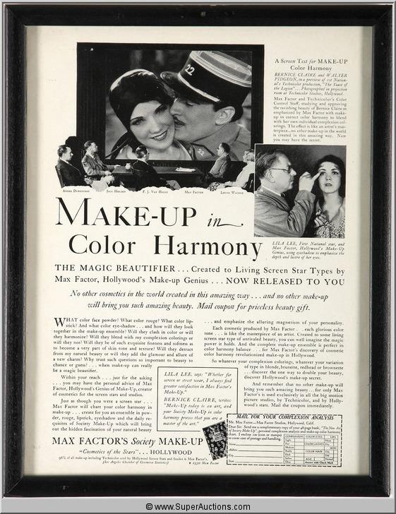 Framed Make-Up Advertisement 1930 Featuring Lila Lee from the Max Factor Collection {9 1/2" H x 12" L}