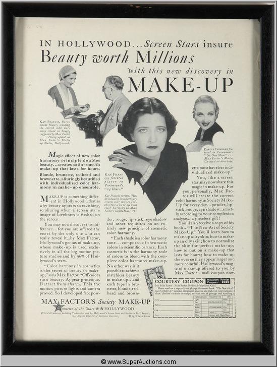 Framed Make-Up Advertisement 1931 Featuring Kay Francis and Carole Lombard from the Max Factor Collection {10" L x 13" H}
