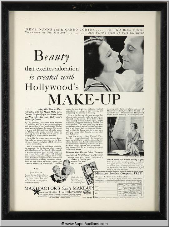 Framed Make-Up Advertisement 1932 Featuring Irene Dunne, Ricardo Cortez and Jean Harlow from the Max Factor Collection {10" L x 13" H}