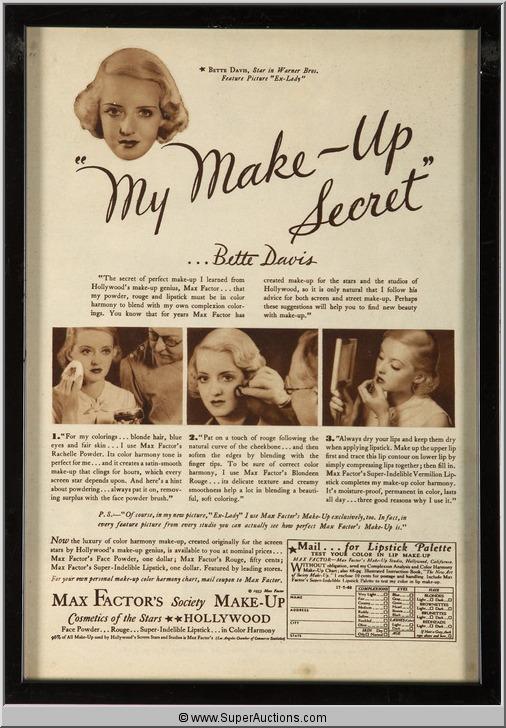 Framed Make-Up Advertisement 1933 Featuring Bette Davis from the Max Factor Collection {8 1/2" L x 12" H}