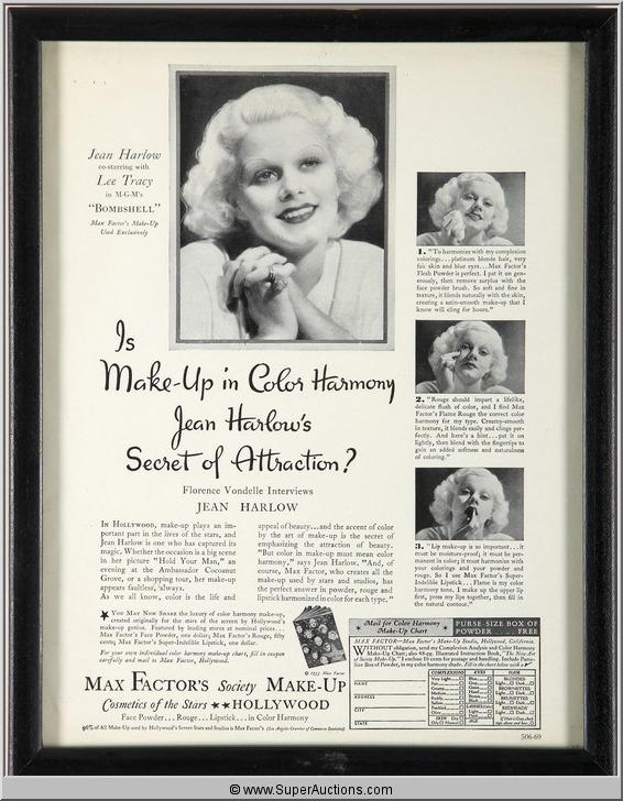 Framed Make-Up Advertisement 1933 Featuring Jean Harlow from the Max Factor Collection {9 1/2" L x 12" H}