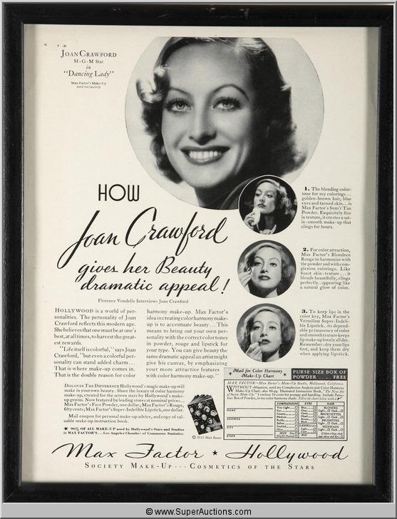 Framed Make-Up Advertisement 1933 Featuring Joan Crawford from the Max Factor Collection {9 1/2" L x 12" H}