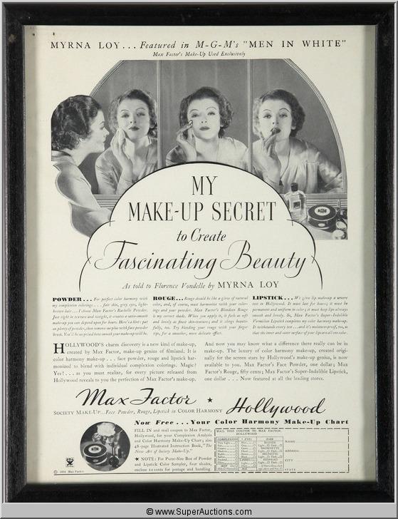 Framed Make-Up Advertisement 1934 Featuring Myrna Loy from the Max Factor Collection {9" L x 12" H}