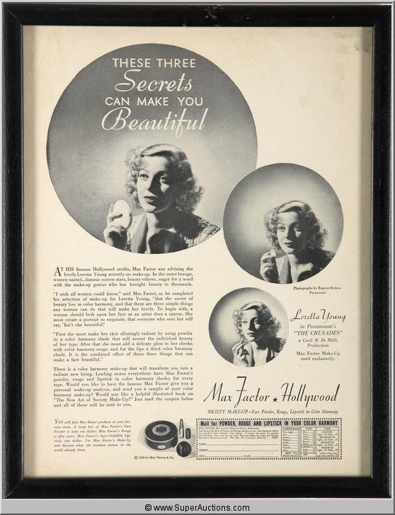 Framed Make-Up Advertisement 1935 Featuring Loretta Young from the Max Factor Collection {9 1/2"L x 12" H}