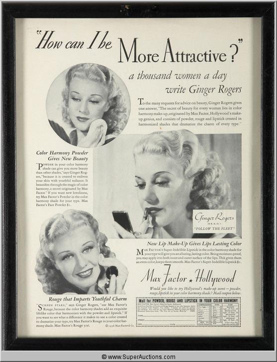 Framed Make-Up Advertisement 1936 Featuring Ginger Rogers from the Max Factor Collection 9 1/2" L x 12" H}