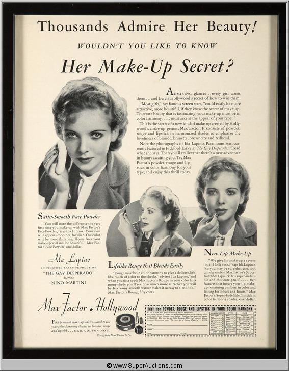 Framed Make-Up Advertisement 1936 Featuring Ida Lupino from the Max Factor Collection {9 1/2" L x 12" H}