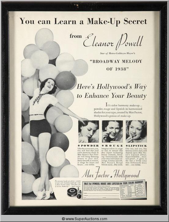 Framed Make-Up Advertisement 1937 Featuring Eleanor Powell from the Max Factor Collection {9 1/2" L x 12" H}