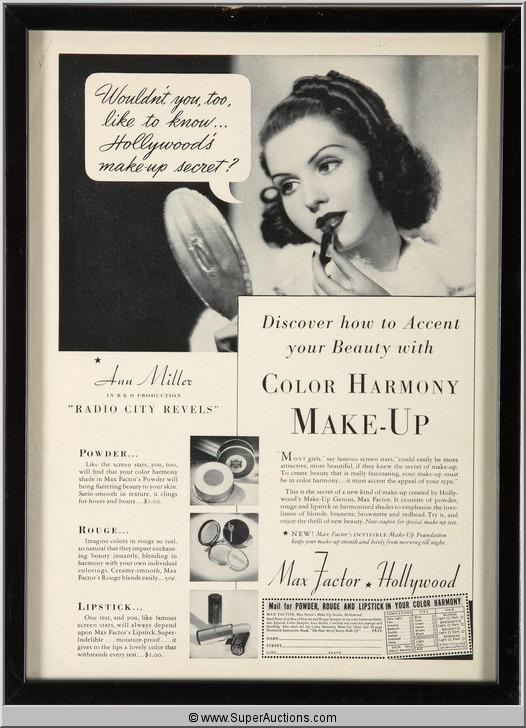 Framed Make-Up Advertisement 1938 Featuring Ann Miller from the Max Factor Collection {8 1/2" L x 11 1/2" H}