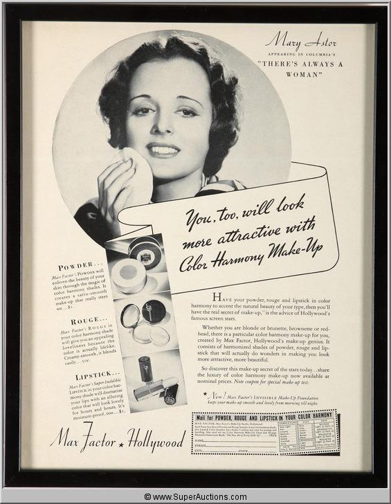 Framed Make-Up Advertisement Featuring Mary Astor from the Max Factor Collection {9 1/2" L x 11 1/2 H}
