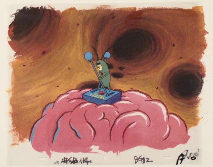 This animation cel and reproduction background are from the Nickelodeon TV show SpongeBob Squarepants. The story takes place under the deep blue sea in Bikini Bottom, where SpongeBob resides. SpongeBob, who is a yellow, porous sponge, is your typical happy-go-lucky character, as he is always cheerful and enjoys making people laugh. Patrick Star, SpongeBob's neighbor who is a starfish, is your average children's show idiot, as he boasts knowing nothing and is often getting himself into ridiculous situations. Between the homes of these two lies the home of the miserable Squidward, a squid, who is known for being grouchy and playing tricks on SpongeBob and Patrick. Both SpongeBob and Squidward work at the Krusty Krab, a fast food business run by the greedy money-loving Mr. Krabs, a crab, the arch rival of the evil, possibly misunderstood, Plankton. Another neighbor, Sandy Cheeks, an athletic squirrel who normally wears an astronaut's space suit, was introduced in "Tea at the Treedome." She spends most of her time inventing and experimenting. Plankton is making SpongeBob walk.Original Printed Background and Animated Cel Overall Size of Background: 11" x 17" Overall Size of the Cel: 10 1/2" x 12 1/2" Very good condition This is an original hand-painted cel set-up used in the production of an episode of "SpongeBob SquarePants." Each one-of-a-kind set-up represents a slight change in position of the characters. When individually photographed and projected in rapid succession, the images appear to move.