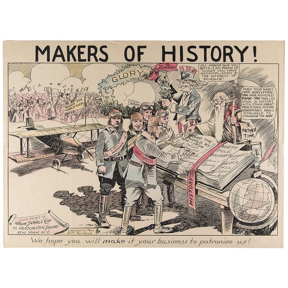 Scarce circa 1924 color 26.5 x 19.75 poster published as part of a weekly series by Artwin Service Corp. of New York, entitled "Makers of History!," portraying the 'round-the-world fliers' signing the guestbook of Father Time as Uncle Sam bestows laurels upon them. The cartoon places these aviators—Lowell Smith, Erik Nelson, Leigh Wade, Leslie Arnold, and John Harding—amidst the likes of Admiral Peary ('North Pole Discovered') and Christopher Columbus ('Discovery of America 1492') in Father Time's log of history. In fine condition, with intersecting folds and some light border creasing.