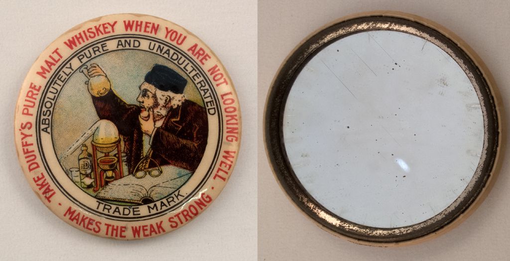 1.75 " Travel Mirror- ABSOLUTELY PURE AND UNADULTERATED- TAKE DUFFY'S PURE MALT WHISKEY WHEN YOU ARE NOT LOOKING WELL- made by J.B. Carroll Chicago-great condition