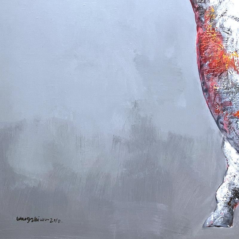 "Making Faces" is an original mixed media painting on canvas by Wang, hand signed by the artist. This piece comes gallery wrapped. Includes Letter of Authenticity. Measures approx. 59" x 43" (image). There is horizontal crease along the top-right edge, an