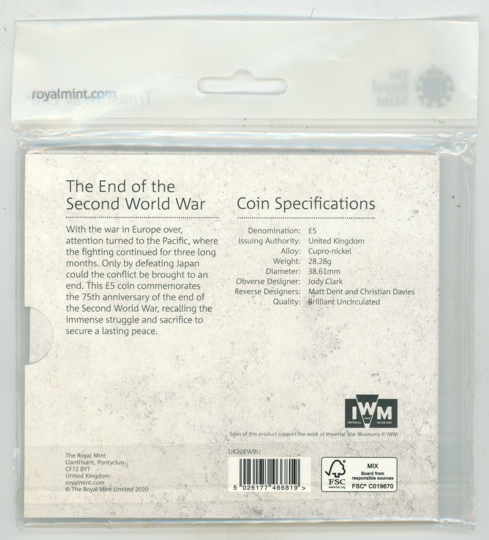 Making Peace. 2020 Royal Mint marking the End of the Second World War 5 Pounds. Brilliant Uncirculated. Housed in its original unopened RM folder.