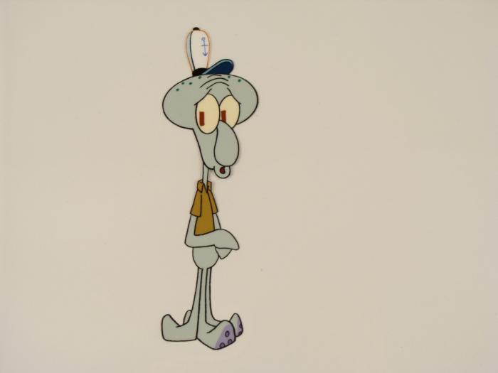 This original animation cel is from the Nickelodeon TV show SpongeBob Squarepants. The story takes place under the deep blue sea in Bikini Bottom, where SpongeBob resides. SpongeBob, who is a yellow, porous sponge, is your typical happy-go-lucky character, as he is always cheerful and enjoys making people laugh. Patrick Star, SpongeBob's neighbor who is a starfish, is your average children's show idiot, as he boasts knowing nothing and is often getting himself into ridiculous situations. Between the homes of these two lies the home of the miserable Squidward, a squid, who is known for being grouchy and playing tricks on SpongeBob and Patrick. Both SpongeBob and Squidward work at the Krusty Krab, a fast food business run by the greedy money-loving Mr. Krabs, a crab, the arch rival of the evil, possibly misunderstood, Plankton. Another neighbor, Sandy Cheeks, an athletic squirrel who normally wears an astronaut's space suit, was introduced in "Tea at the Treedome." She spends most of her time inventing and experimenting. Squidward is making a "O" shape with his mouth. Original Production Animated Cel Overall Size of Cel: 10 1/2" x 12 1/2" Excellent ConditionThis is an original hand-painted cel set-up used in the production of an episode of "SpongeBob SquarePants." Each one-of-a-kind set-up represents a slight change in position of the characters. When individually photographed and projected in rapid succession, the images appear to move.