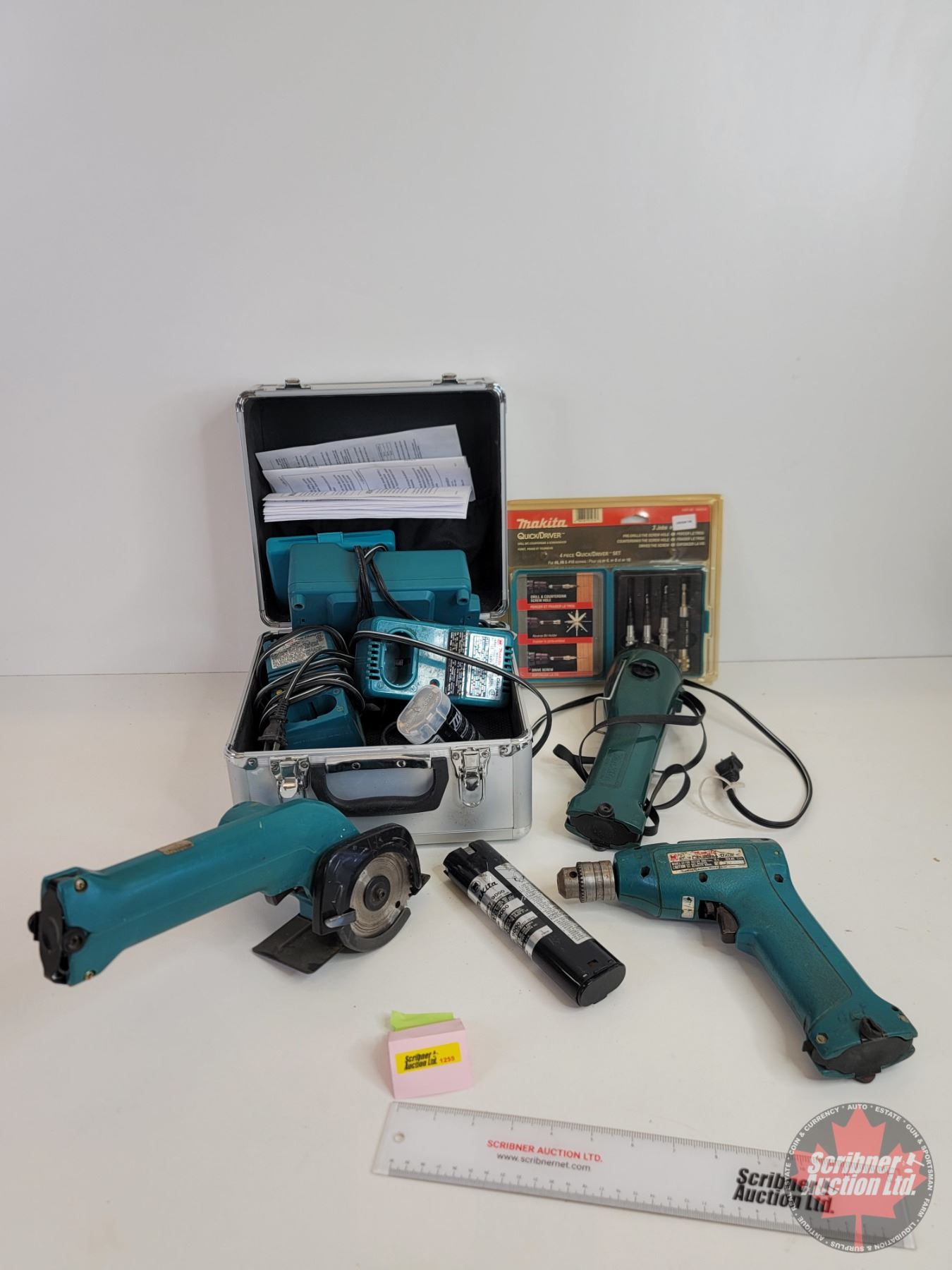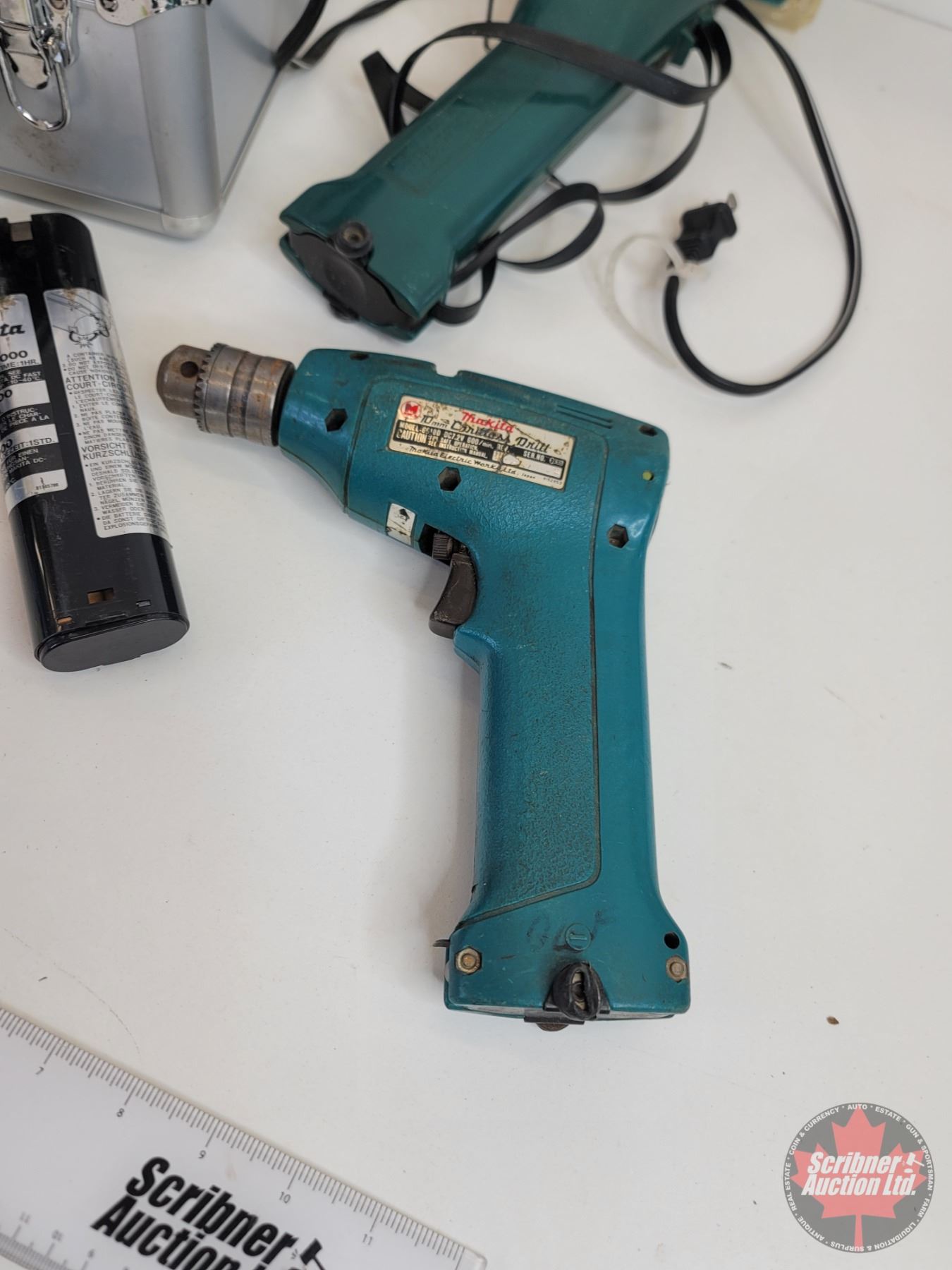 Makita Tools including Hand Saw, Drill, Flashlight & Quick/Driver Drill Set w/Metal Makita Case (9.6V & 7.2V)
