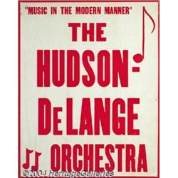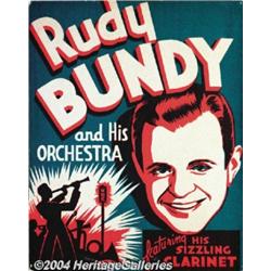 <B>Mal Hallet, Hudson-DeLange, and Rudy Bundy Unsigned Window Cards.</B></I> Mal Hallet hailed from Boston, and his 1930s big band that toured all over the New England states was actually one of the first great swing ensembles. Mal's pioneering contributions to the Big Band Era make him an important name. This card is done in orange, blue, purple, and white ink, with Hallett's image going beyond the border using his hairline as a border. Minor defects are pin holes at each corner and normal age wear, plus slight edge bending at lower left corner. The Hudson-DeLange Orchestra was formed in the mid-1930s by songwriters Will Hudson and Eddie DeLange. Some of Eddie's successful lyrics were "Deep in a Dream", "Remember When", and "Moonglow". Some of Will Hudson's successes were "Sophisticated Swing", "Eight Bars in Search of a Melody", and "Organ Grinder's Swing." This unsigned card is printed in red ink over a cream-colored background with music notes used as a graphic instead of any photos. The band's logo, "Music in the Modern Manner," is also listed. There are pinholes in each corner, and the card shows normal age wear. Rudy Bundy was an extremely capable clarinetist who led a big band during the 1930s, but he eventually gave up music to become the Vice-President of Ringling Bros. Barnum and Bailey Circus. This colorful card has nice graphic design. Pin holes at each corner and slight edge damage at the corners would not be evident if framed. 3 items <BR><BR><B>Important notice:</B> Heritage usually auctions material at the rate of 200-250 lots per hour. On some occasions eBay Live bid software or the Internet may not be able to keep up with the pace of the auction. We recommend placing a realistic absentee bid now as insurance to avoid disappointment. Occasionally the auctioneer may eliminate or reject an eBay Live bid, and the auctioneer may also reopen a lot after the close of the eBay live bidding (usually because we missed an audience bid), and may reject your bid even if it shows you as the winning bidder. By bidding via eBay Live, you agree that Heritage may award the lot to another bidder at its sole discretion under the circumstances described above or any other reasonable circumstances. Since eBay bids are not shown to us until we open the lot on the floor, we treat those bids just like floor bids. In most cases the floor responds before the eBay bid is presented to us, due to Internet lag time, so for consistency we have made it a policy that floor bids are always considered first over tie eBay live bids. Also please note that all Heritage lots purchased through eBay Live carry a 24.5% Buyer's Premium. Please make sure you read the Terms and Conditions before you bid.