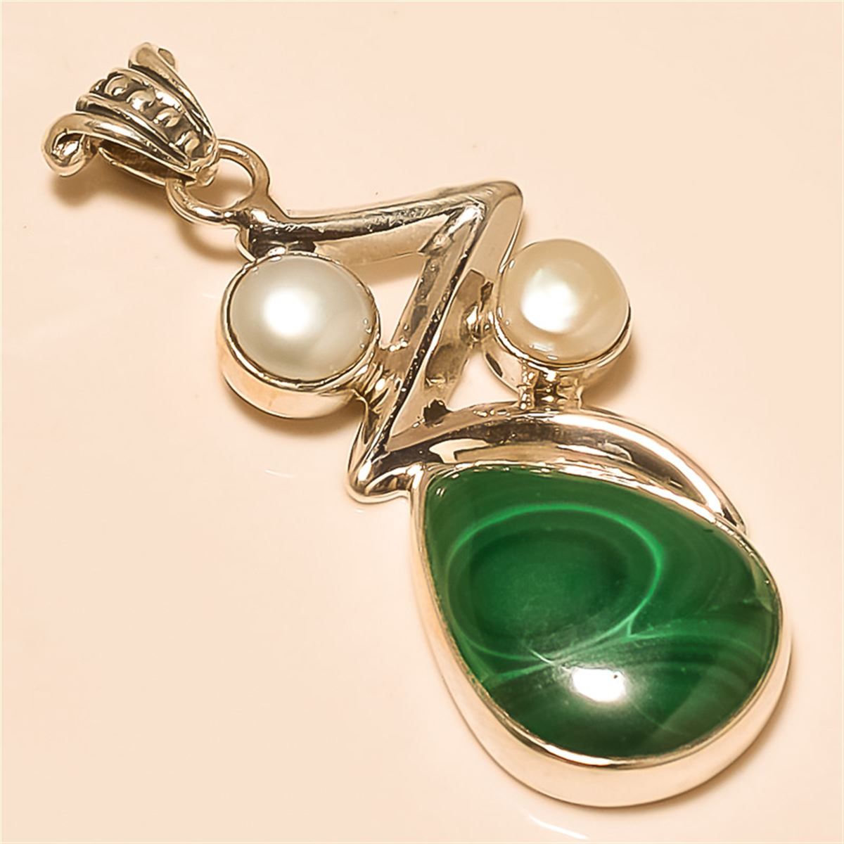 malachite/pearl Pendant Solid Sterling Silver Length:1.75 inch Weight:7 gram #P-216
