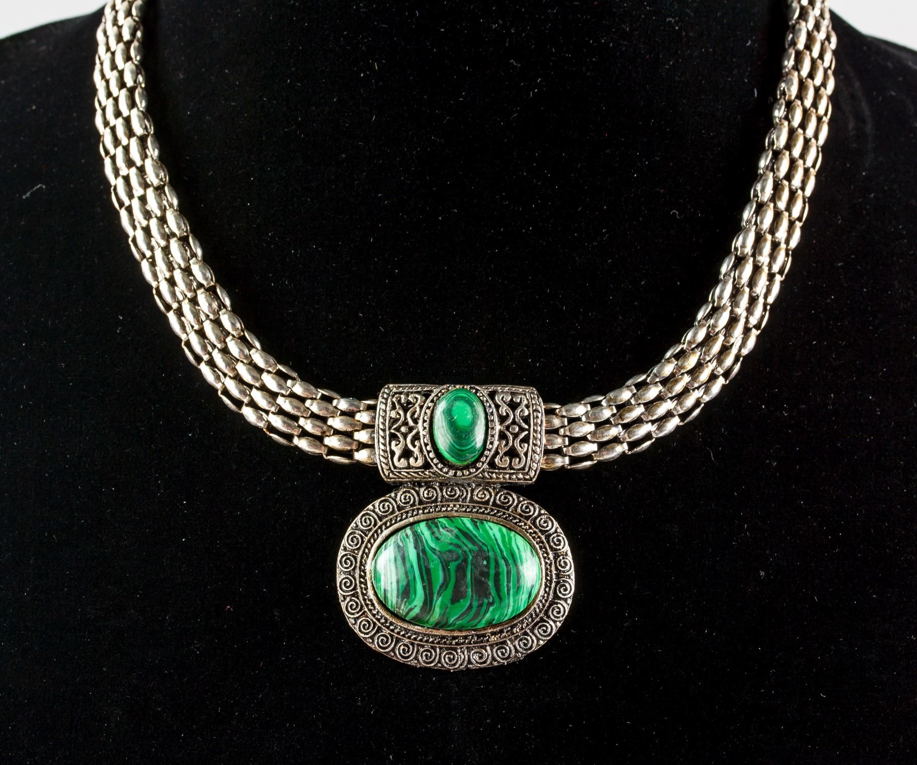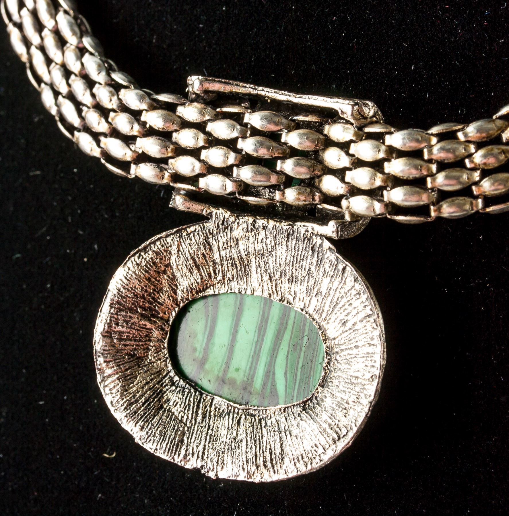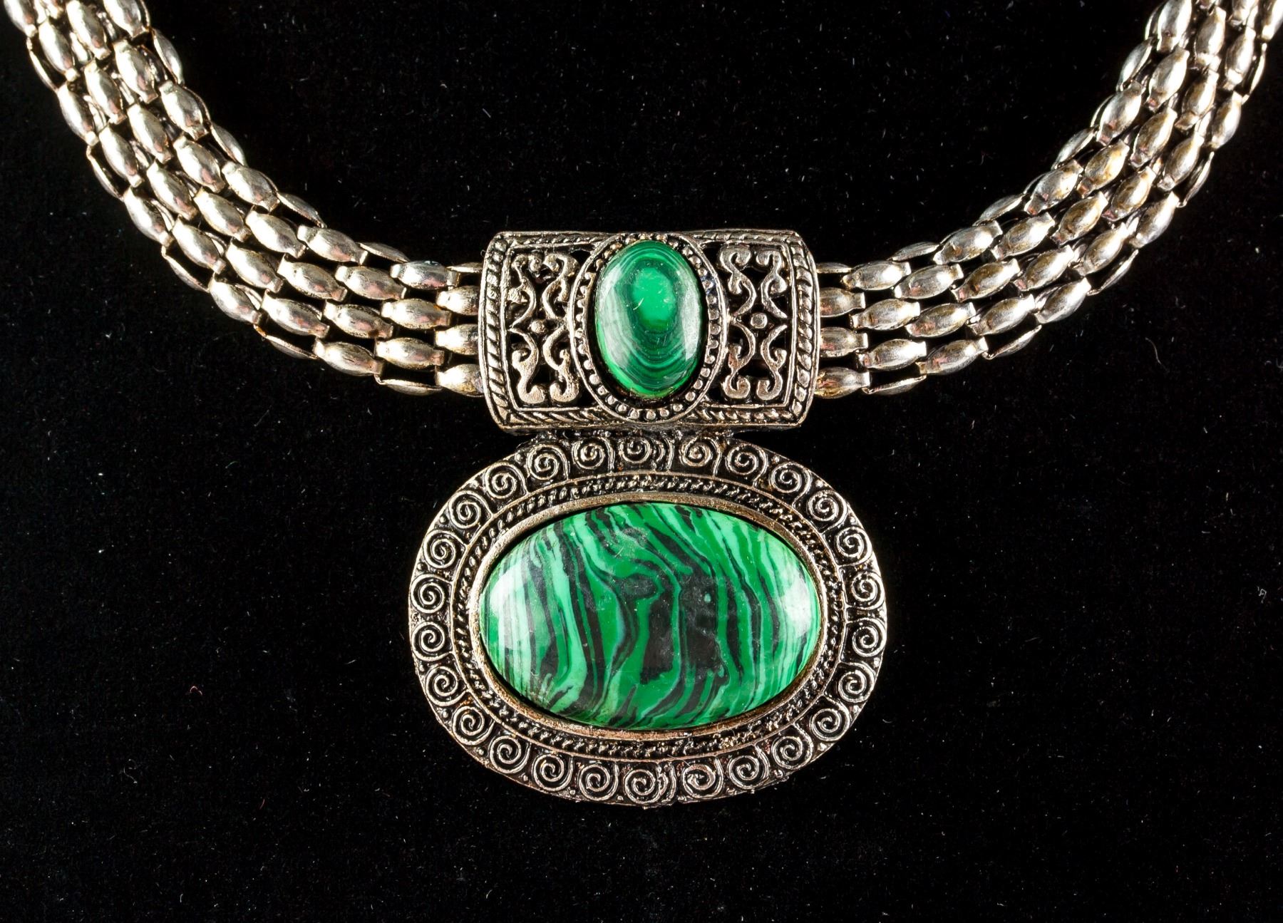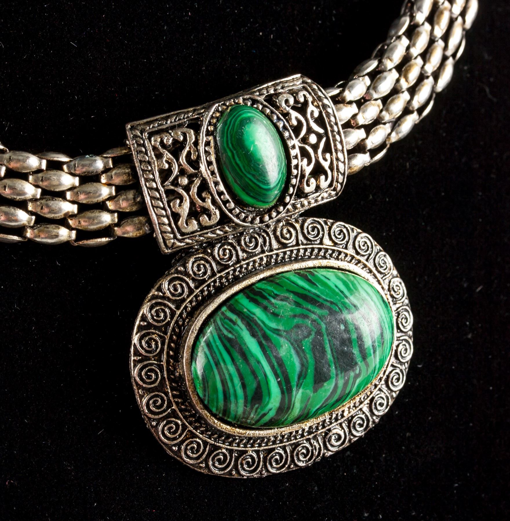 Silver colored necklace set with green and black colored malachite. Length: 30 cm, 50 grams