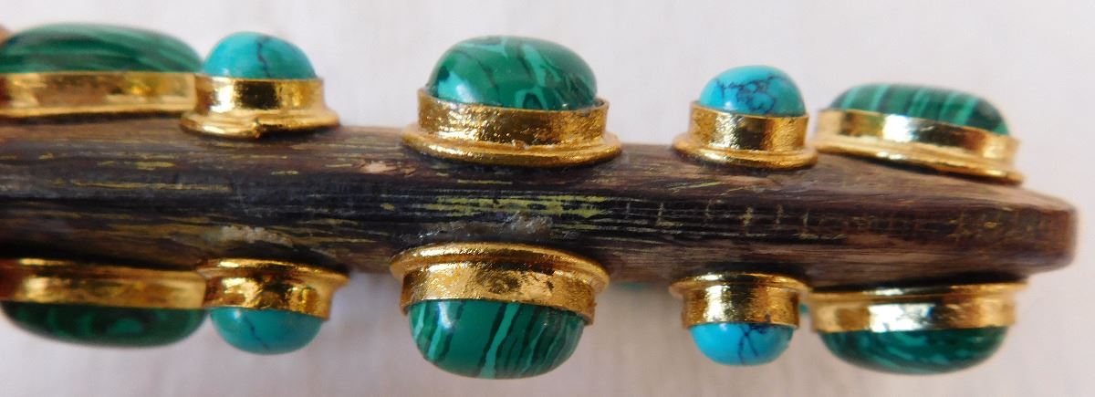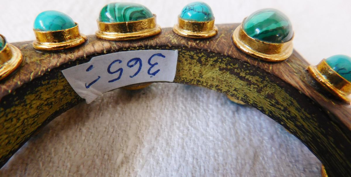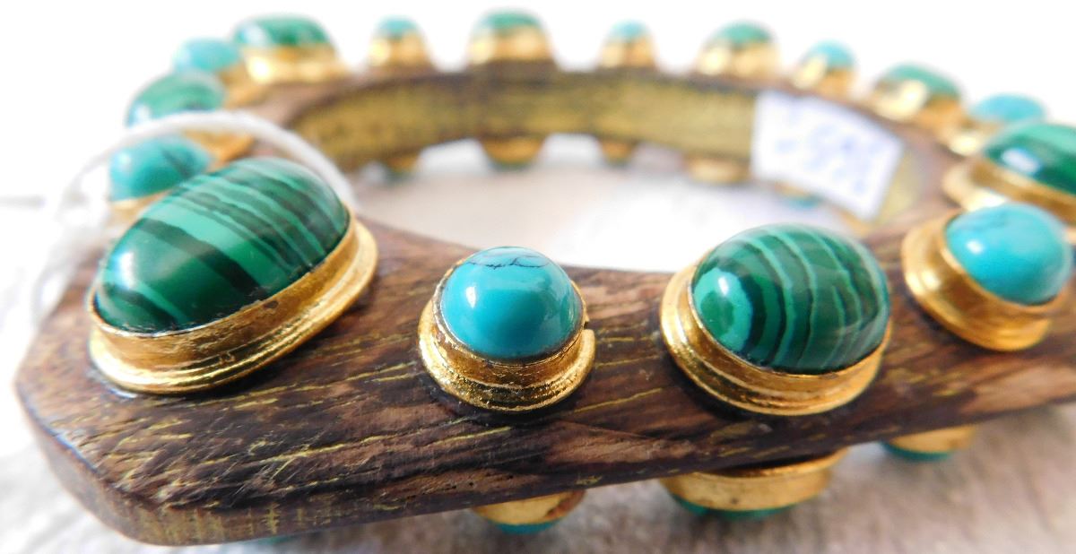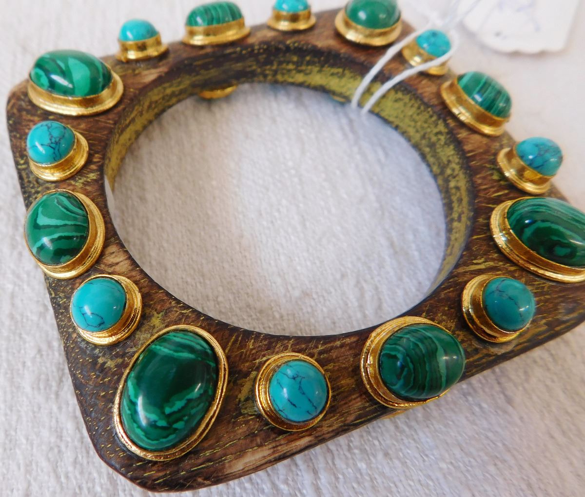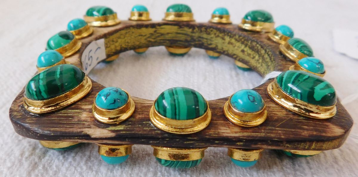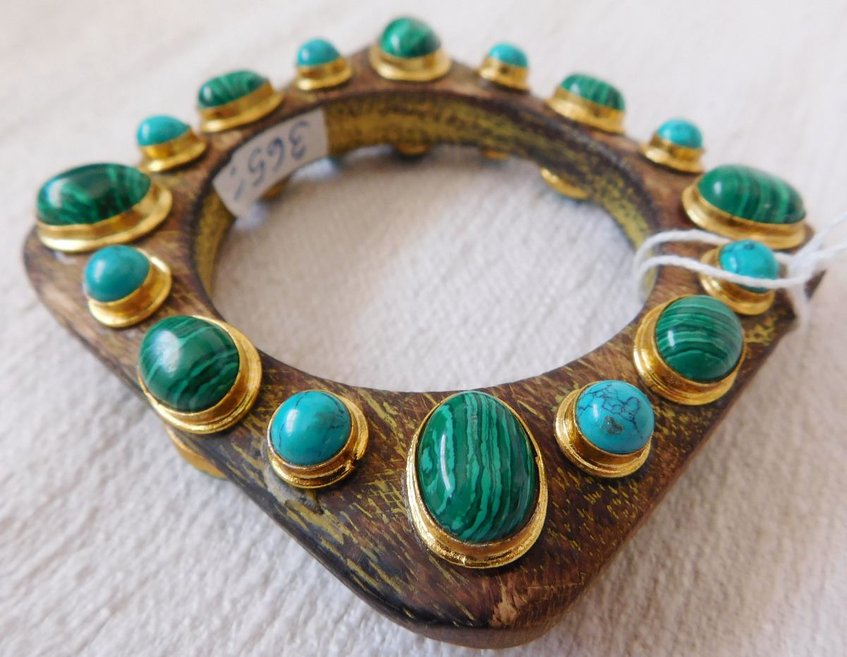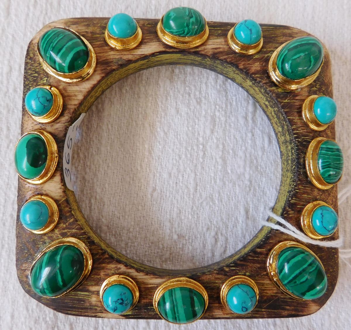 Malachite & Turquoise Wood Cuff, circa 1970s. Made of wood, malachite, and turquoise, the item measures 3.25" x 3.25" x 0.75" with a 2" diameter inside. Likely Mexican. 16 malachite oval-cut stones and 16 round turquoise stones, item weighs approx. 57 grams. Condition: Very good, pre-owned, see images. Shipping: $16.50 w/insurance.