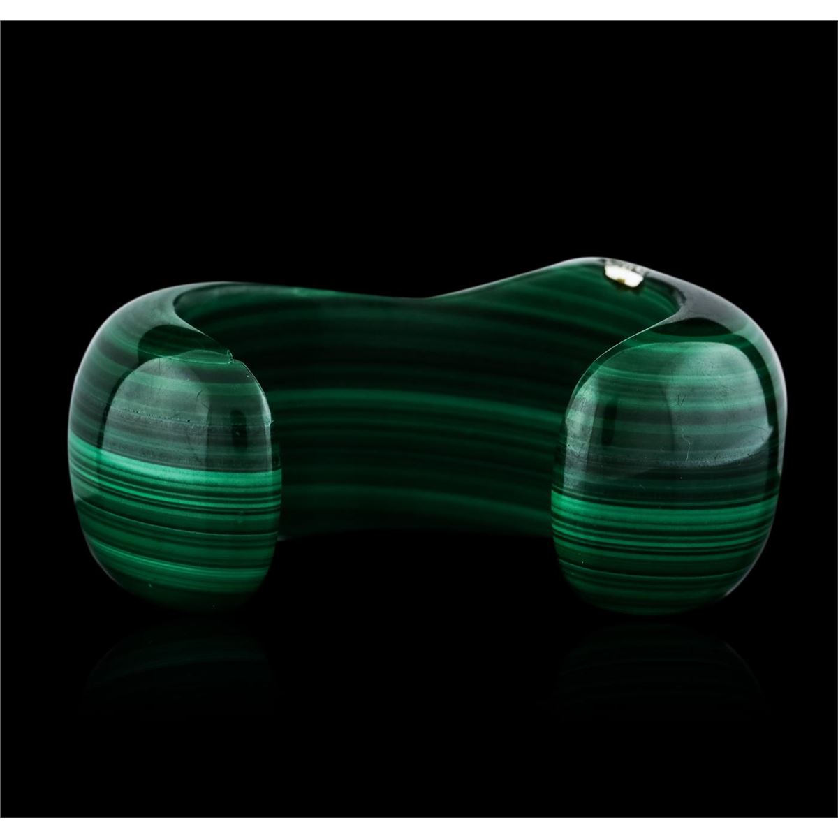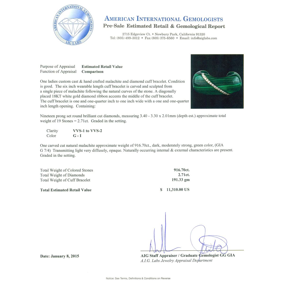 One ladies custom cast & hand crafted malachite and diamond cuff bracelet. The six inch wearable length cuff bracelet is carved and sculpted from a single piece of malachite following the natural curves of the stone. A diagonally placed 18KT white gold diamond ribbon accents the middle of the cuff bracelet. The cuff bracelet is one and one-quarter inch to one inch wide with a one and one-quarter inch length opening. Condition is good. Containing: Nineteen prong set round brilliant cut diamonds, measuring 3.40 - 3.30 x 2.01mm (depth est.) approximate total weight of 19 Stones = 2.71ct. Graded in the setting. Clarity: VVS-1 to VVS-2 Color G - I One carved cut natural malachite approximate weight of 916.70ct., dark, moderately strong, green color, (GIA G 7/4) Transmitting light very diffusely, opaque. Naturally occurring internal & external characteristics are present. Graded in the setting. Total Weight of Colored Stones916.70ct. Total Weight of Diamonds 2.71ct. Total Weight of Cuff Bracelet191.33 grams. AIG Appraised at $11,310.00.