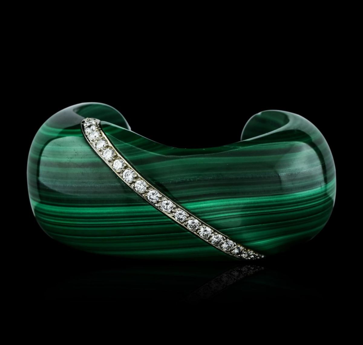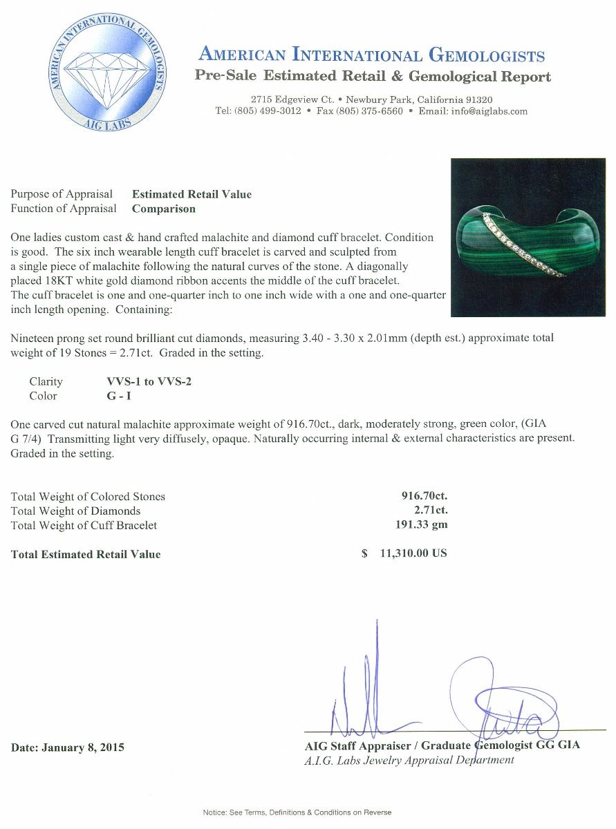One ladies custom cast & hand crafted malachite and diamond cuff bracelet. The six inch wearable length cuff bracelet is carved and sculpted from a single piece of malachite following the natural curves of the stone. A diagonally placed 18KT white gold diamond ribbon accents the middle of the cuff bracelet. The cuff bracelet is one and one-quarter inch to one inch wide with a one and one-quarter inch length opening. Condition is good. Containing: Nineteen prong set round brilliant cut diamonds, measuring 3.40 - 3.30 x 2.01mm (depth est.) approximate total weight of 19 Stones = 2.71ct. Graded in the setting. Clarity: VVS-1 to VVS-2 Color G - I One carved cut natural malachite approximate weight of 916.70ct., dark, moderately strong, green color, (GIA G 7/4) Transmitting light very diffusely, opaque. Naturally occurring internal & external characteristics are present. Graded in the setting. Total Weight of Colored Stones916.70ct. Total Weight of Diamonds 2.71ct. Total Weight of Cuff Bracelet191.33 grams. AIG Appraised at $11,310.00.