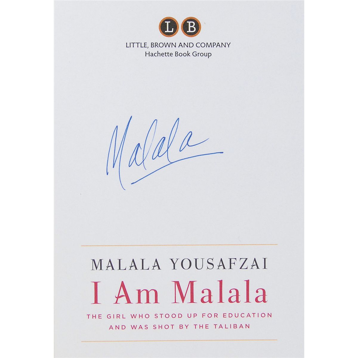 Pakistani activist for female education (born 1997) awarded the Nobel Peace Prize in 2014. Signed book: I Am Malala. First edition, first printing. NY: Little, Brown and Company, 2013. Hardcover with dust jacket, 6.25 x 9.5, 327 pages. Signed in blue felt tip on a bookplate affixed to the half-title page, “Malala.” In very fine condition.