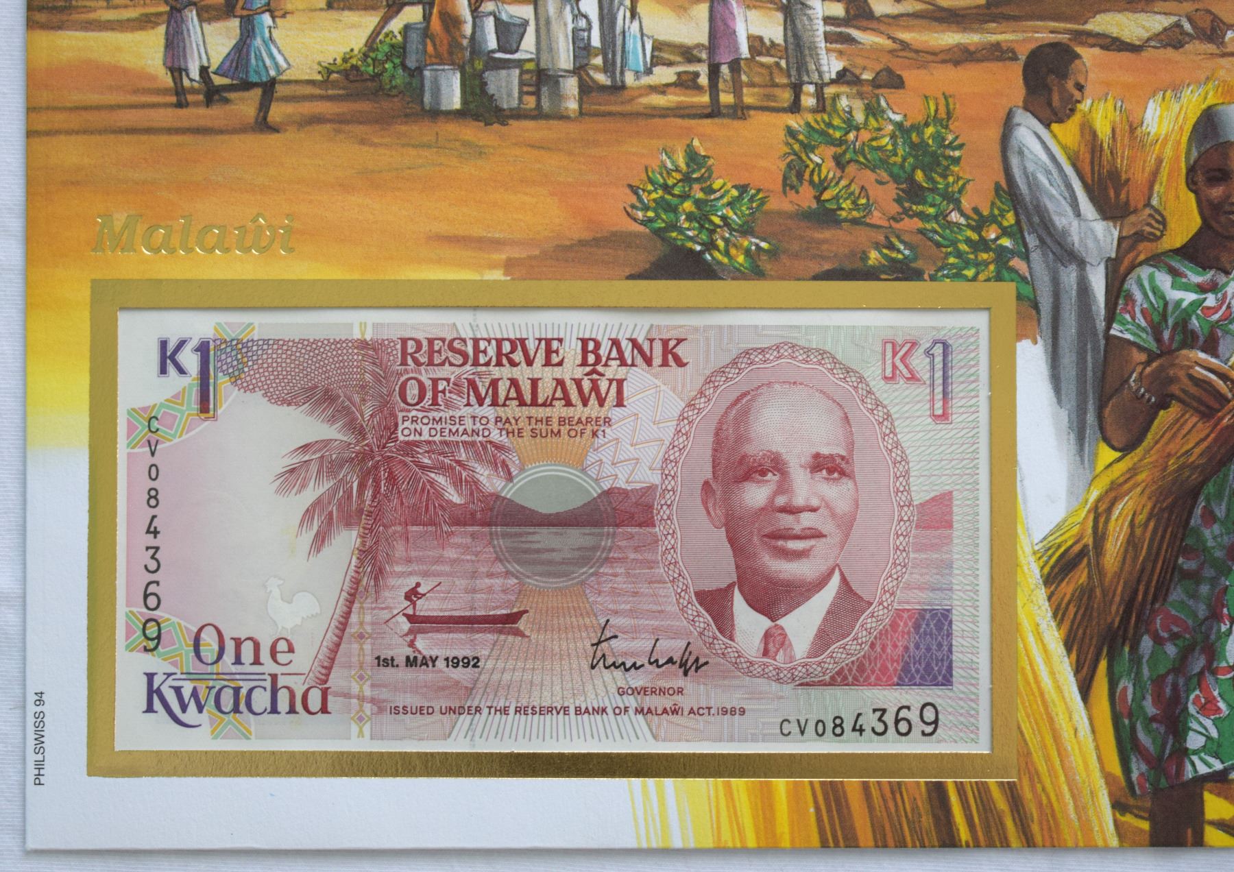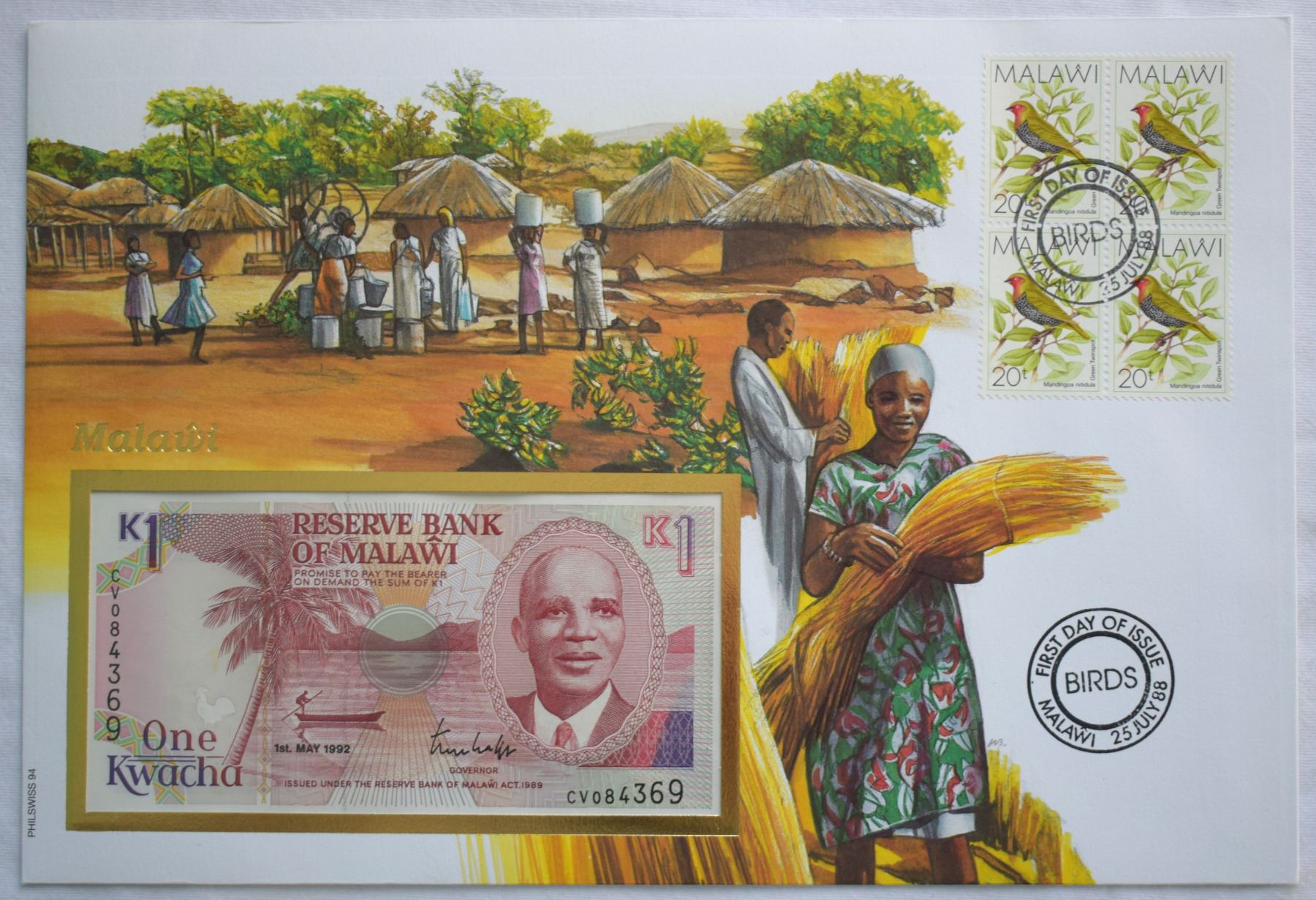 Malawi, 1 Kwacha 1992 First Day Cover Swiss Issued, Pick# 23b Nice Vignette "Tribal Scene" w/ Block of 4, Cancelled in Malawi 1988 Mint as Issued Impecable.