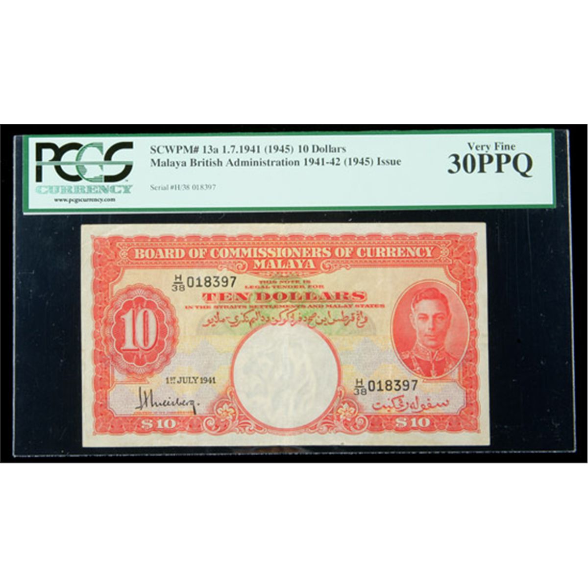 Malaya SCWPM# 13a, 1.7.1941 (1945) 10 Dollars. PCGS Very Fine 30PPQ. . Fr-P-13a. Problem-free for the grade, with moderate signs of circulation the only grade limiting factor.