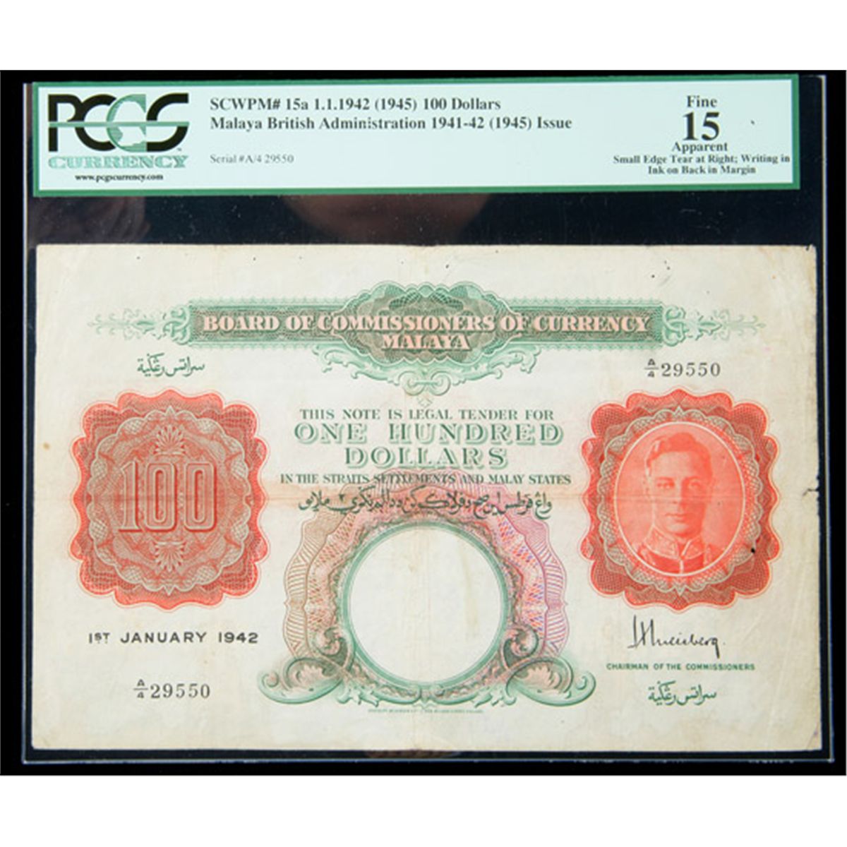 Malaya SCWPM# 15a, 1.1.1942 (1945) 100 Dollars. PCGS Fine 15 Apparent. . Fr-P-15a. This is a very scarce issue, and even low grade examples are highly sought by collectors. This piece has some minor flaws, PCGS Currency noting the "small edge tear at right" and "writing in ink on back in margin" as reasons for the "Apparent" grade.