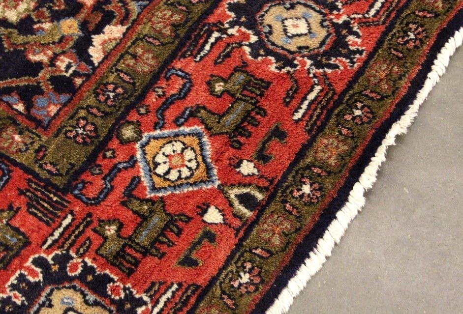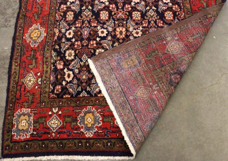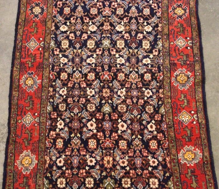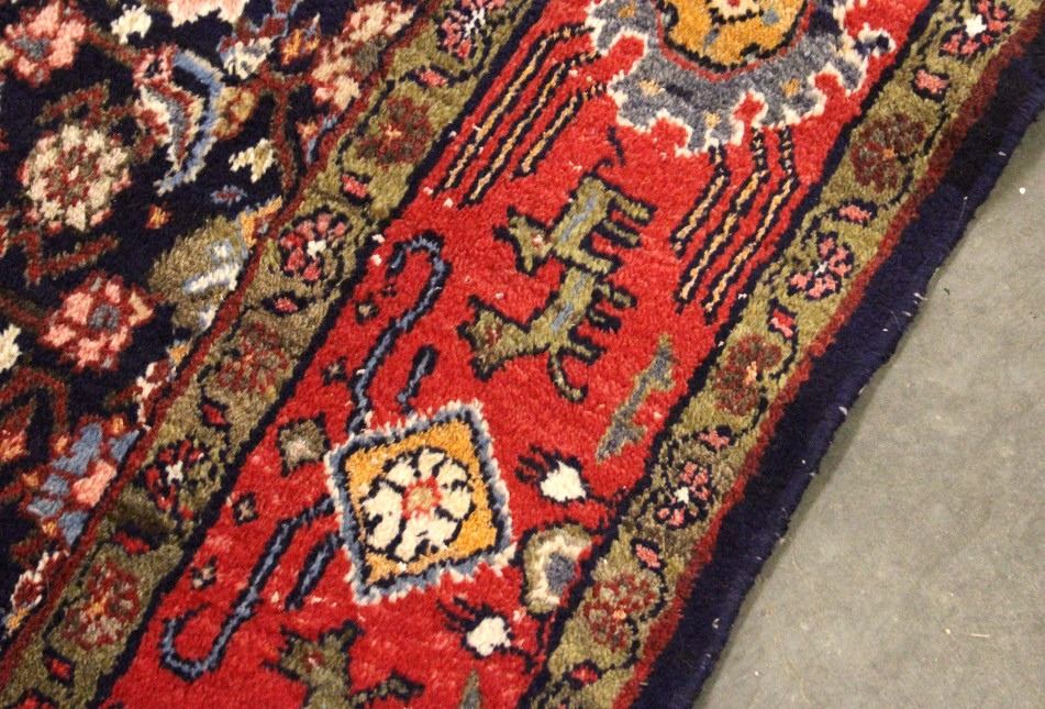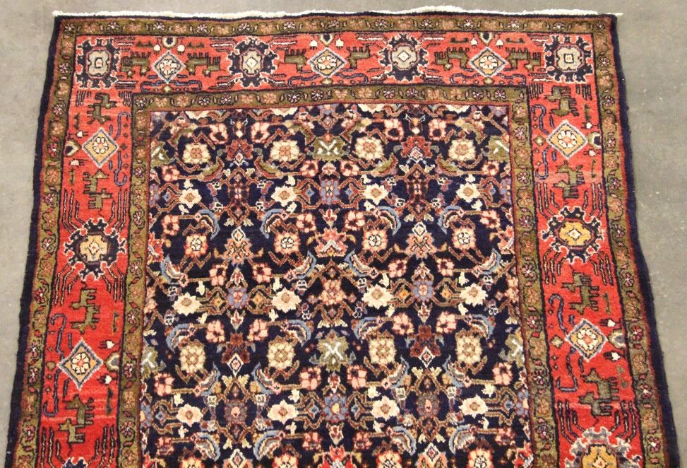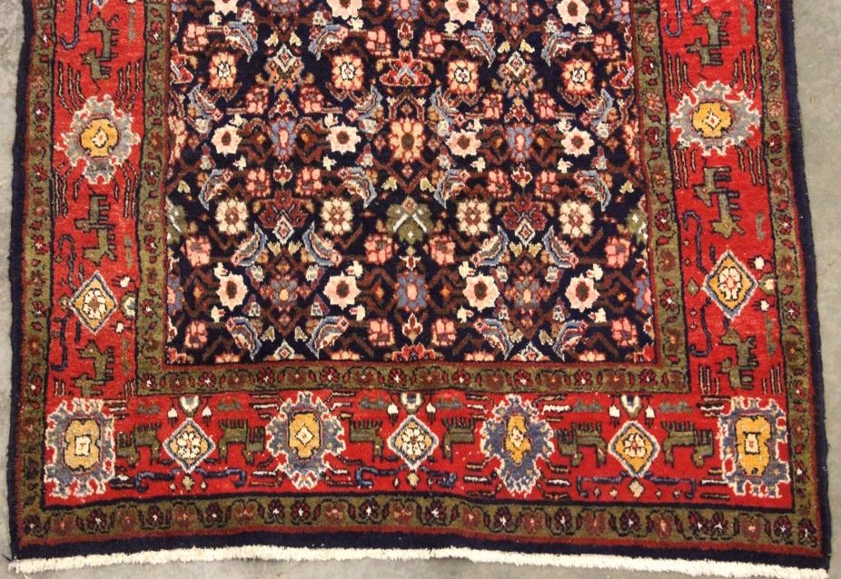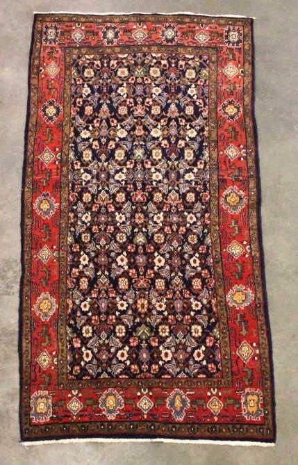 This hand woven Malayer design Persian rug comes with a certificate of authenticity. It is a ornately design rug that brings a certain warm feel to the room. The weave is tight and it has a leather backing along the edge. It is in good condition for its age. It was previously appraised at $5,333. It measures 64" W x 120" L
