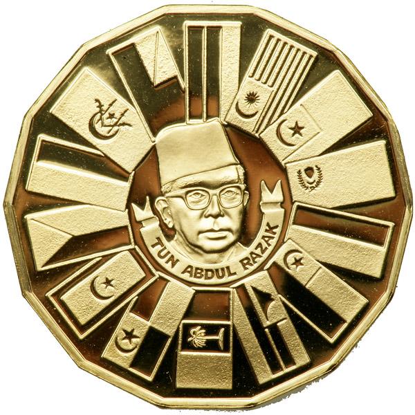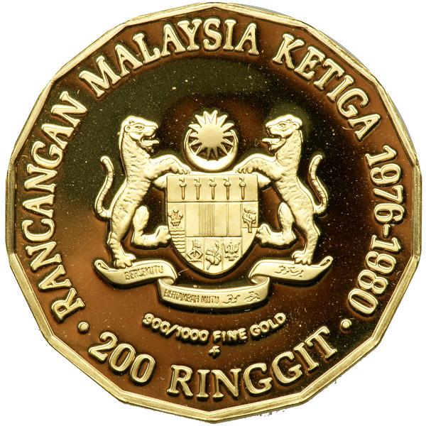 Malaysia. 200 Ringgit, 1976. Fr-2; KM-18. Weight 0.2112 ounce. Mintage 887 pieces. Third Malaysian 5-Year Plan. The only fourteen sided gold coin. Choice Brilliant Proof.