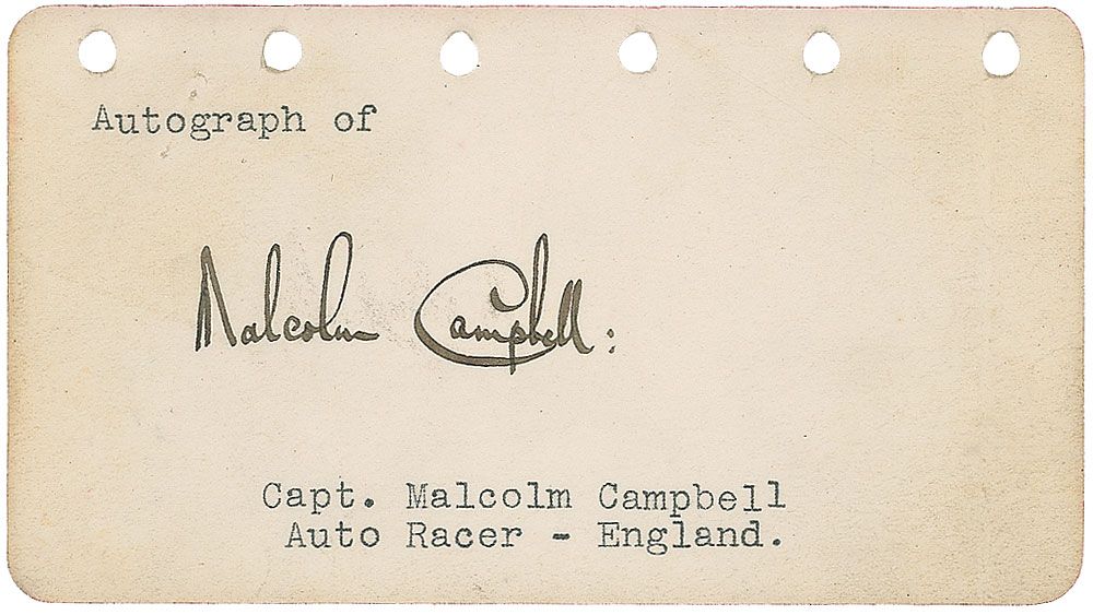 English auto and speedboat racer (1885–1948) who held the world records for both land speed and water speed at several times during the 1920s and 1930s. Vintage ink signature, “Malcolm Campbell,” on an off-white 4.5 x 2.5 page. In fine condition, with mild edge toning.