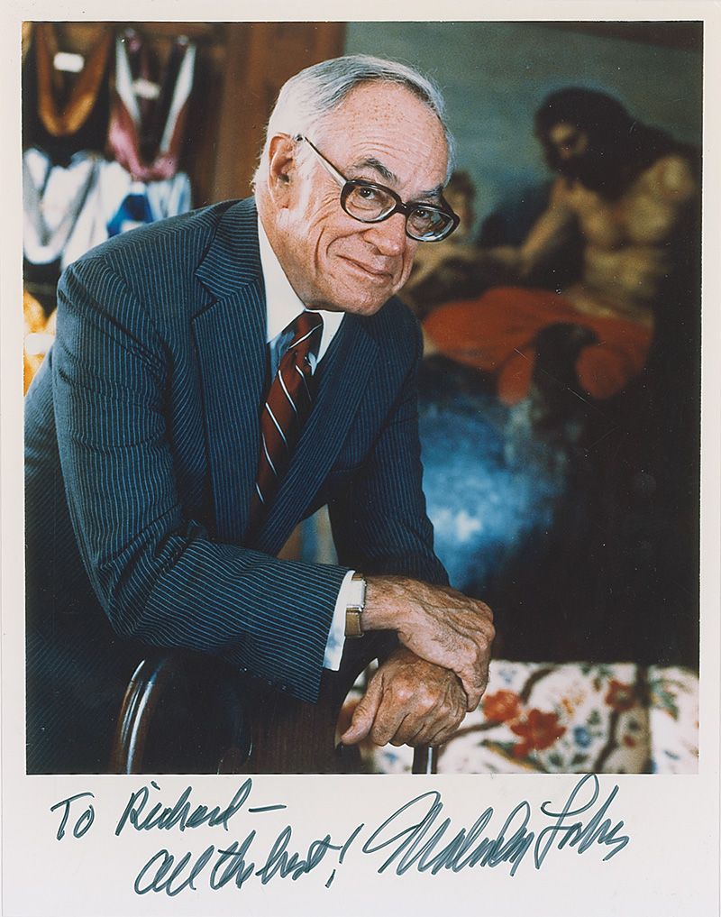 Color satin-finish 8 x 10 photo, signed and inscribed in the lower border in black felt tip “To Richard—All the best! Malcolm Forbes.” In fine condition.