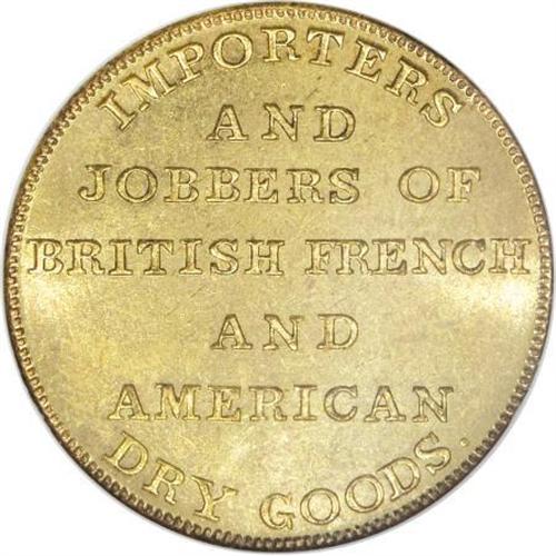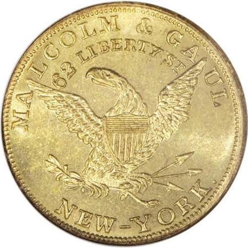 <B>(1850's) Malcolm & Gaul, New York, NY, MS64 NGC.</B></I> Miller-NY-516. Brass, reeded edge. A semi-prooflike near-Gem with flashy fields and a penetrating strike. An unblemished and thoroughly attractive piece that likely ranks among the finest known survivors. Rulau reports that importers Malcolm & Gaul were listed in a 1849 New York merchant directory.<BR><BR><b>Shipping:</b> Coins & Currency (<a target="_blank" href="http://www.heritageauctions.com/common/shipping.php">view shipping information</a>)