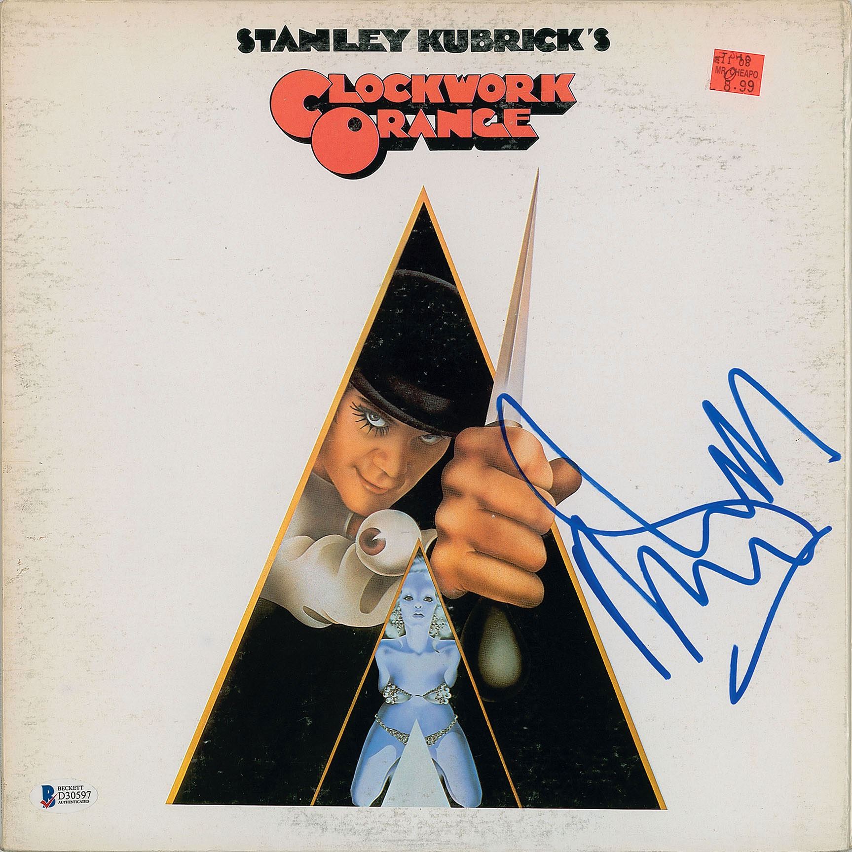 A Clockwork Orange soundtrack album signed on the front cover in blue felt tip by Malcolm McDowell. In fine condition, with light scuffing, an affixed price sticker, and a Beckett authenticity label affixed to lower left corner. The record is included.