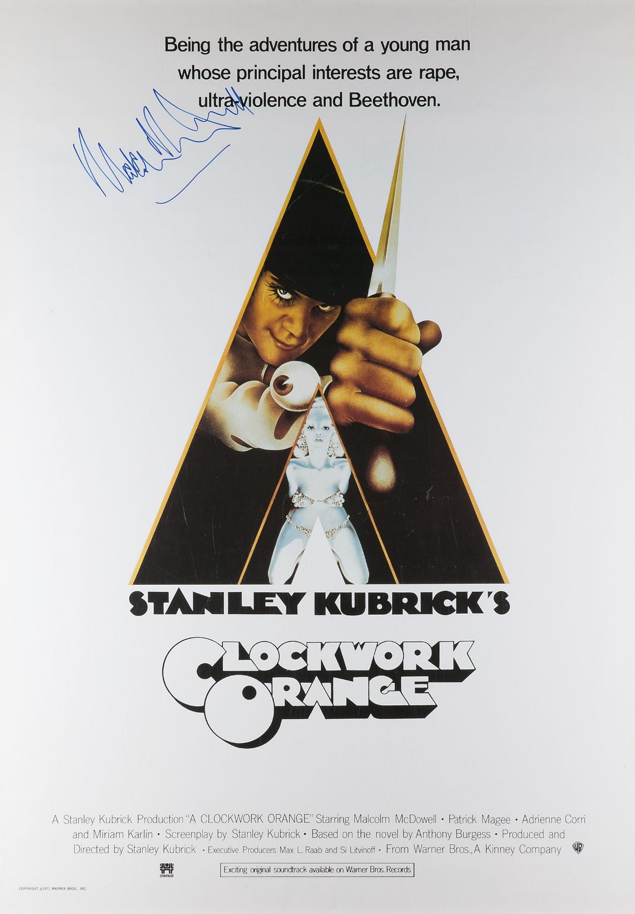 Color 27 x 38.5 reprint poster for Stanley Kubrick's A Clockwork Orange, signed in blue felt tip by Malcolm McDowell. Rolled and in fine condition. Originally obtained by in-person specialist Mike Wehrmann.