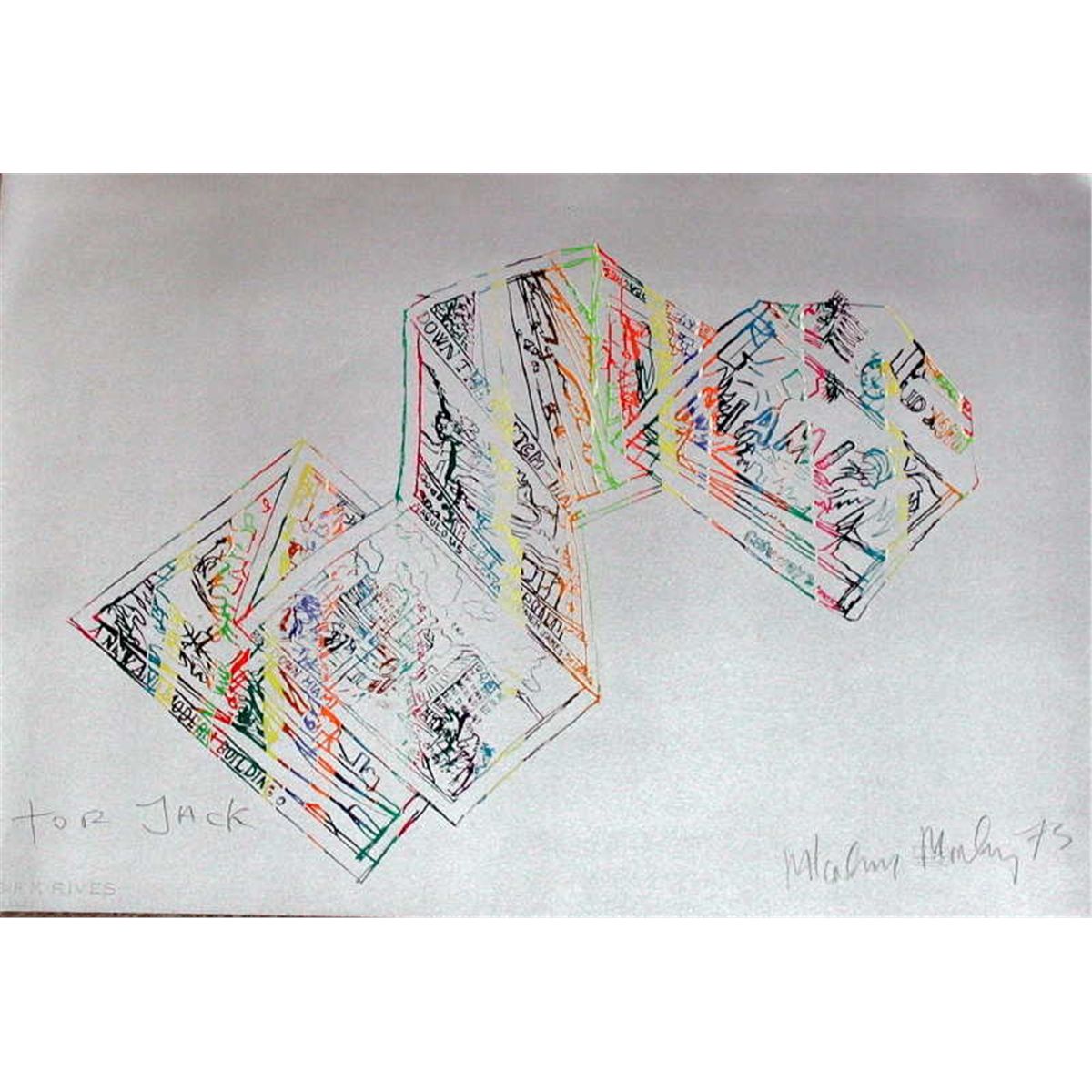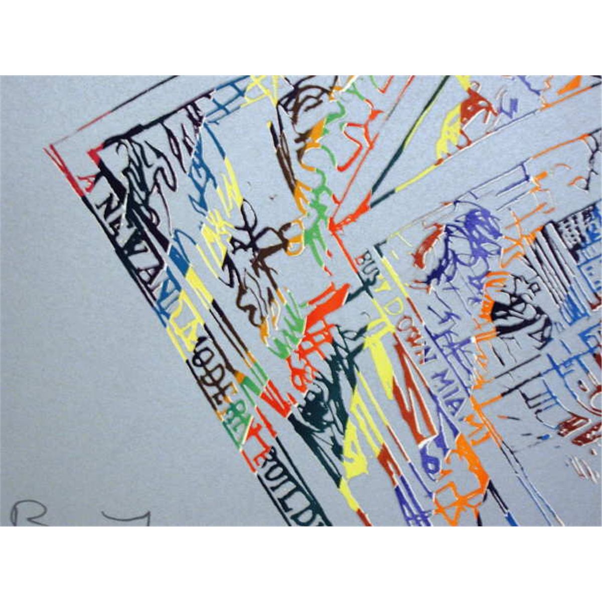 From the "Arles/Miami" Portfolio of 5 lithographs published in 1973. These were the first original, hand drawn prints ever created by Morley and, as such, are important for any serious collection. . This image was printed in a rainbow of colors on a silver background. 24"x34" on Arches paper. Signed in pencil by the artist and dedicated to the Director of the Atelier aside from the edition of 150. Subject matter is a fold-out picture postcard of Miami. “This very unique print was made by printing it in 20 colors using 5 stones with 4 colors each. As a result of scrupulous matching, the image shifts color in narrow ripples from crimson to purple to green to dark blue to peacock blue to yellow and so on. The linear outline is dissolved by the elusive definition and by the rhythmic repetition of color.” Lawrence Alloway.. Domestic Shipping-$20. International depends upon location..
