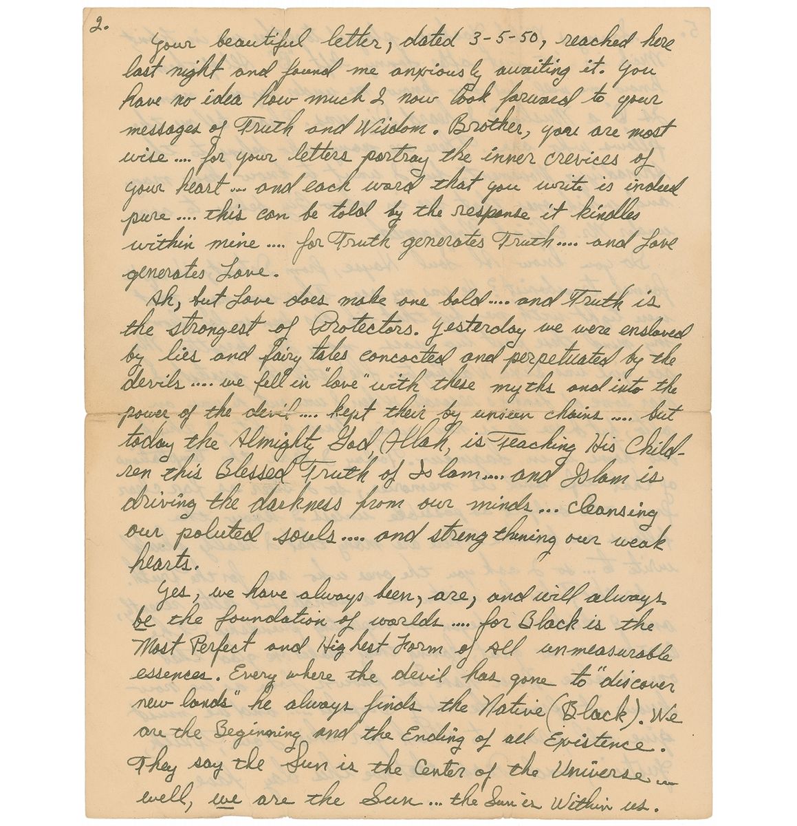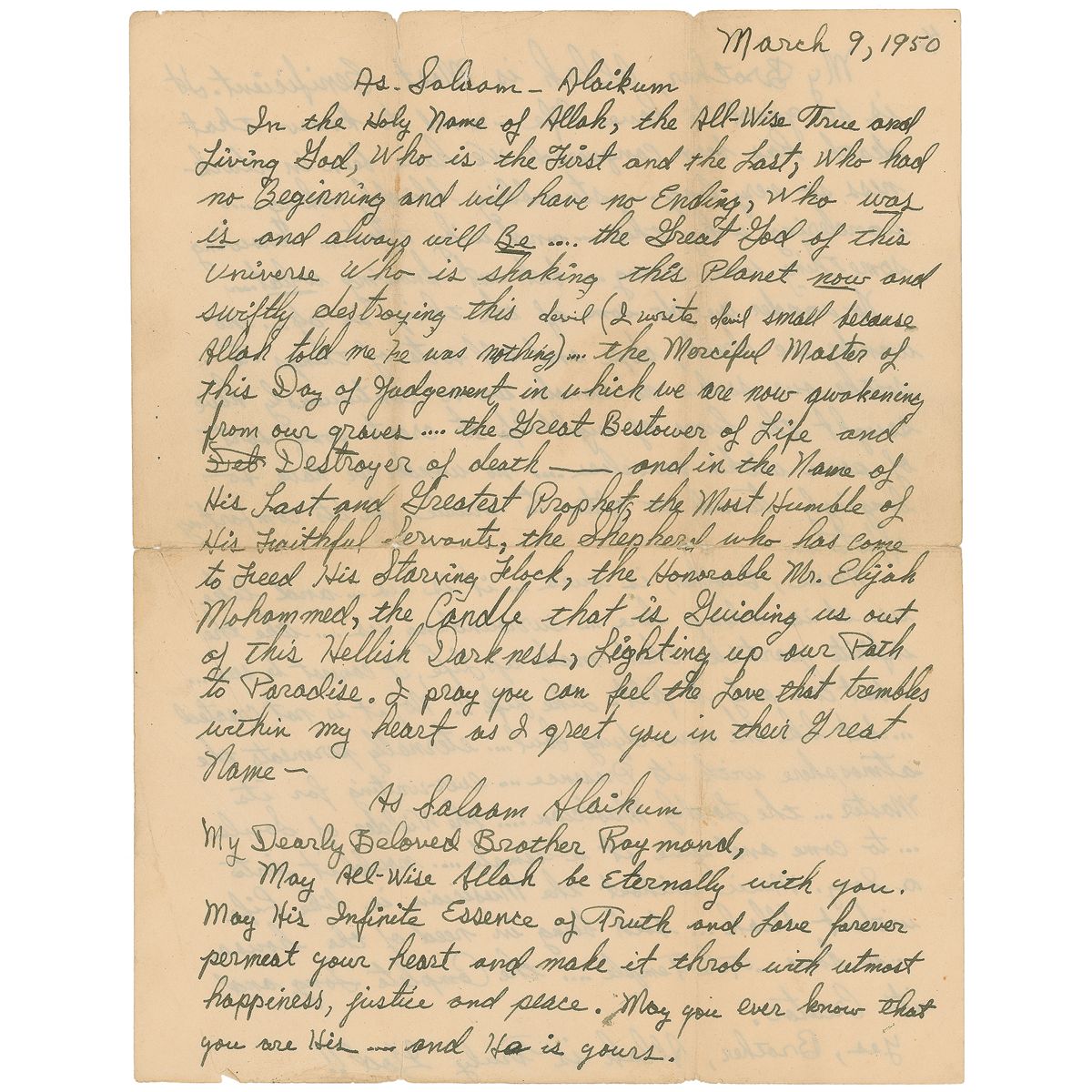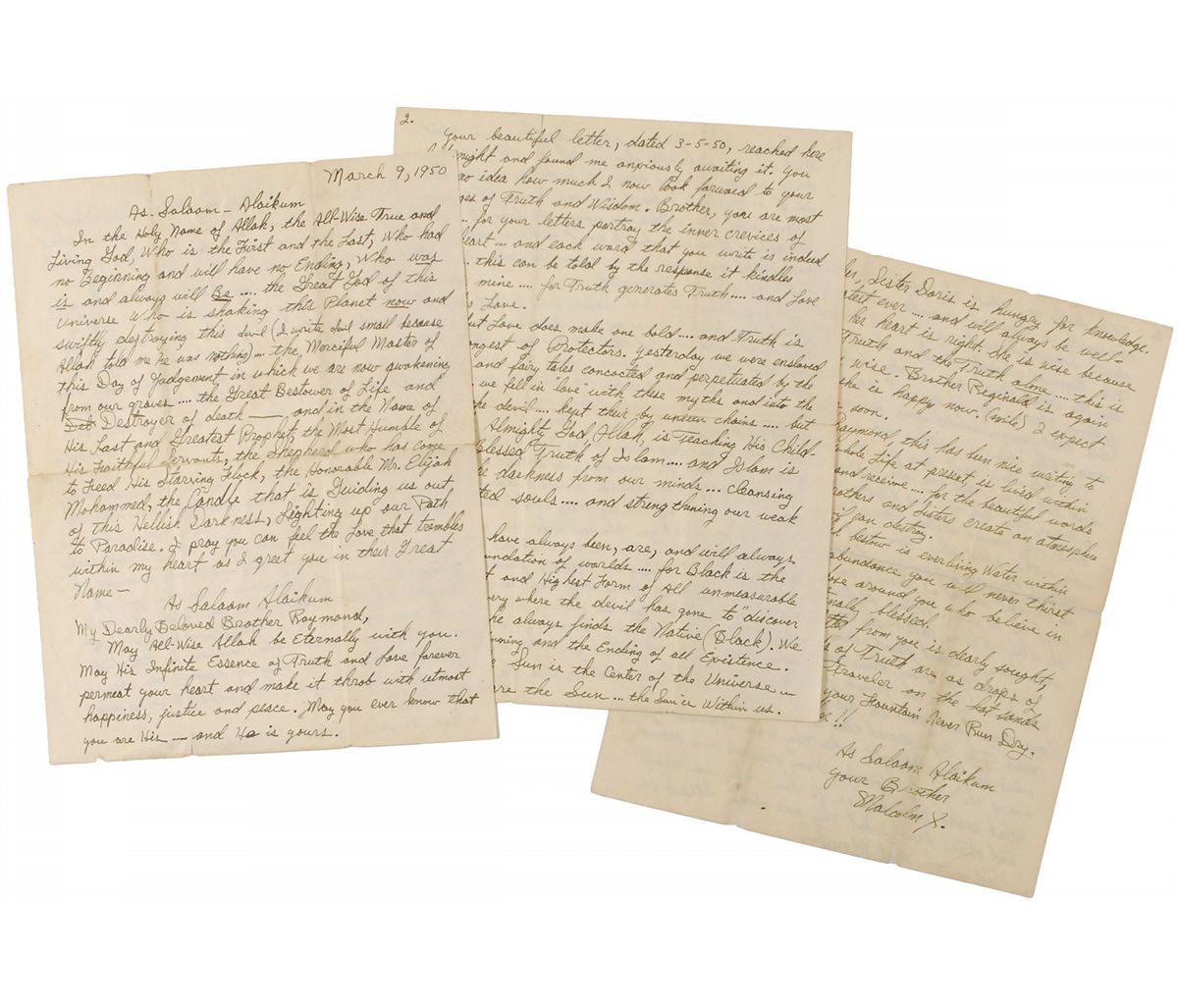 ALS signed “As Salaam Alaikum, your Brother, Malcolm X,” three pages both sides, 8.5 x 11, March 9, 1950. A letter to a fellow member of the Nation of Islam, written while serving time in Norfolk, Massachusetts, after being convicted of larceny and breaking and entering. In part (spelling and grammar retained): “Enslaved by lies and fairy tales concocted and perpetuated by the devils…we fell in 'love' with these myths…kept their by unseen chains…but today the Almighty God, Allah, is Teaching His Children this Blessed Truth of Islam…and...driving the darkness from our minds…cleansing our polluted souls…and strengthening our weak hearts.