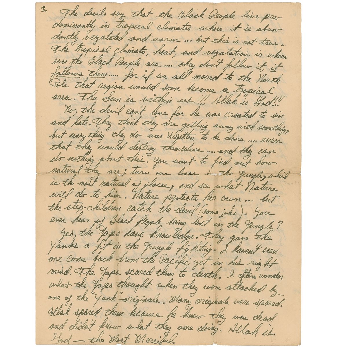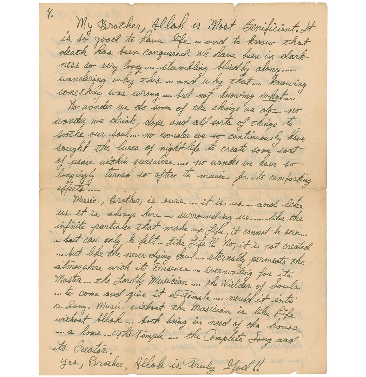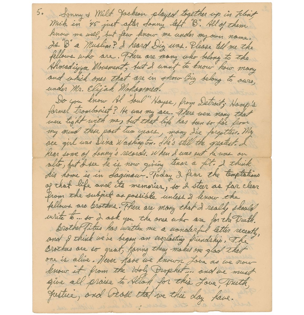 I hear some of Sonny’s records. When I was out he was on alto, but I see he is now giving tenor a fit. I think his home is in Saginaw. Today I fear the temptations of that life and its memories, so I steer as far clear from the subject as possible unless I know the fellows are brothers. There are many that I really should write to…so I ask you the ones who are for the Truth...my whole life at present, is lived within the letters I write and receive…for the beautiful words from my beloved Brothers and Sisters create an atmosphere for me that no devil can destroy.” In very good condition, with partial separations to intersecting folds (professional repairs to the central horizontal fold of the last page and a few small edge separations), a worn vertical fold passing through the signature, scattered creases, and a few smaller edge tears.