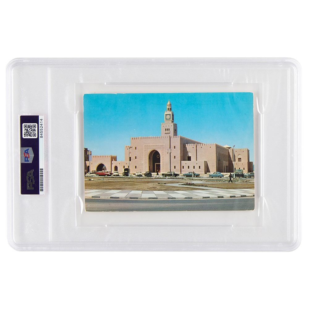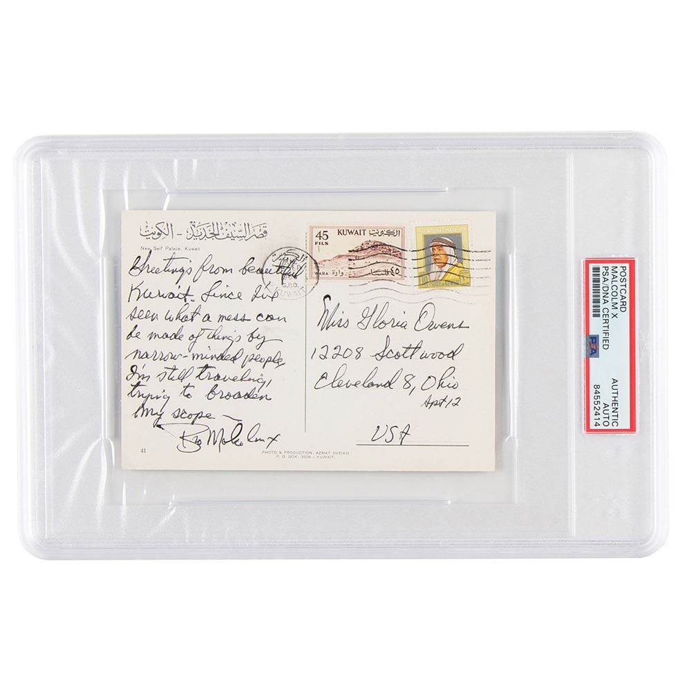 Scarce ALS signed “Bro Malcolm X,†one page on a 5.75 x 4 color postcard depicting Kuwait’s Seif Palace, postmarked in Kuwait on September 26, 1964. Short handwritten letter to "Miss Gloria Owens, 12208 Scottwood, Cleveland 8, Ohio, Apt 12, USA." In full: "Greetings from beautiful Kuwait. Since I’ve seen what a mess can be made of things by narrow-minded people, I’m still traveling, trying to broaden my scope.†Gloria Owens was the sister of Maceo X Owens, secretary at Muhammad's Mosque No. 7 in Harlem where Malcolm X preached alongside Louis Farrakhan. In fine condition. Encapsulated in a PSA/DNA authentication holder.
