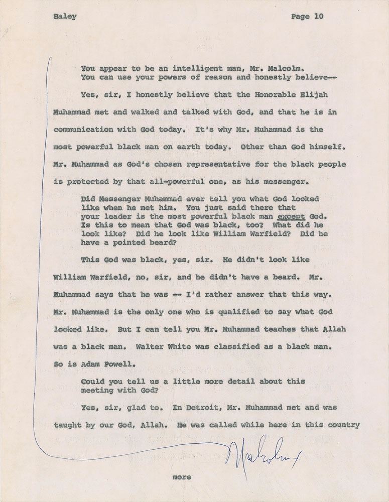 Page from the original typescript of Alex Haley’s 1963 interview of Malcolm X for Playboy magazine, one onionskin page, 8.5 x 11, signed "Malcolm X" in the bottom margin (with a marginal line indicating his approval of the contents). In part: "Yes, sir, I honestly believe that the Honorable Elijah Muhammad met and walked and talked with God, and that he is in communication with God today. It's why Mr. Muhammad is the most powerful black man on earth today. Other than God himself. Mr. Muhammad as God's chosen representative for the black people is protected by that all-powerful one, as his messenger." Haley then poses a follow-up question: "Did Messenger Muhammad ever tell you what God looked like when he met him. You just aid there that your leader is the most powerful black man except God. Is this to mean that God was black, too? What did he look like? Did he look like William Warfield? did he have a pointed beard?" Malcolm X responds: "This God was black, yes, sir. He didn't look like William Warfield, no, sir, and he didn't have a beard. Mr. Muhammad says that he was—I'd rather answer that this way. Mr. Muhammad is the only one who is qualified to say what Good looked like. But I can tell you that Mr. Muhammad teaches that Allah was a black man. Walter White was classified as a black man. So is Adam Powell." In fine condition.