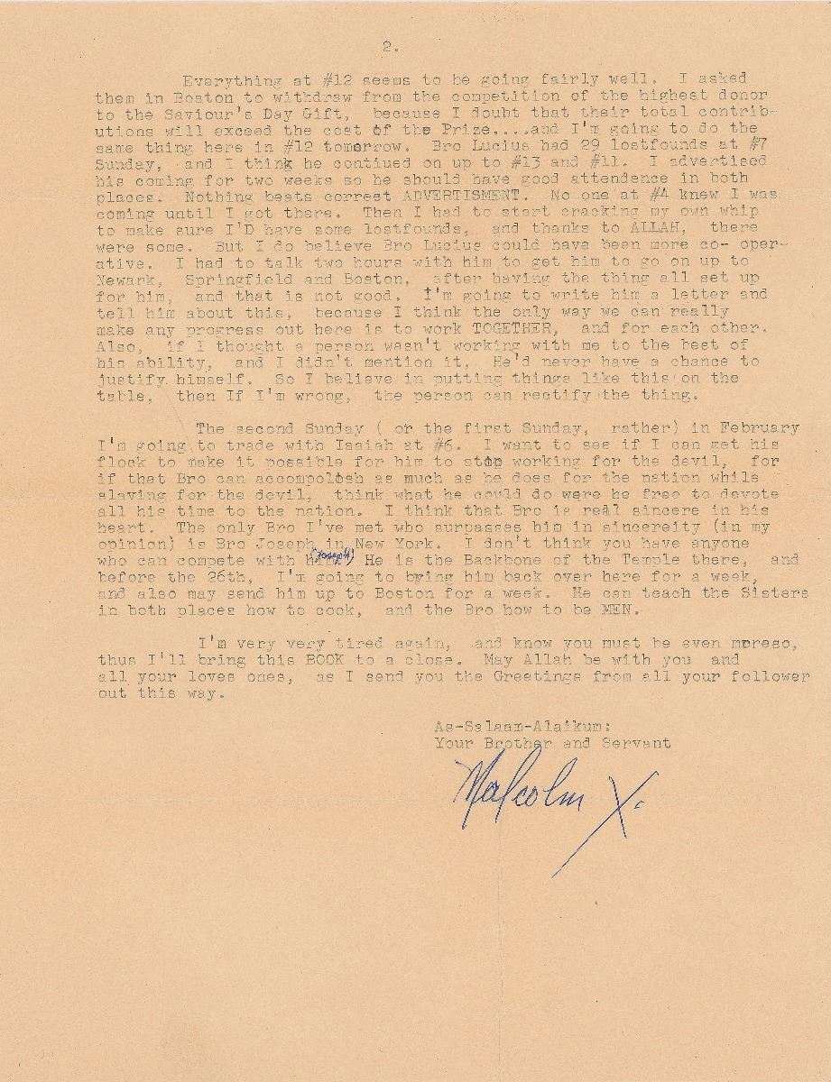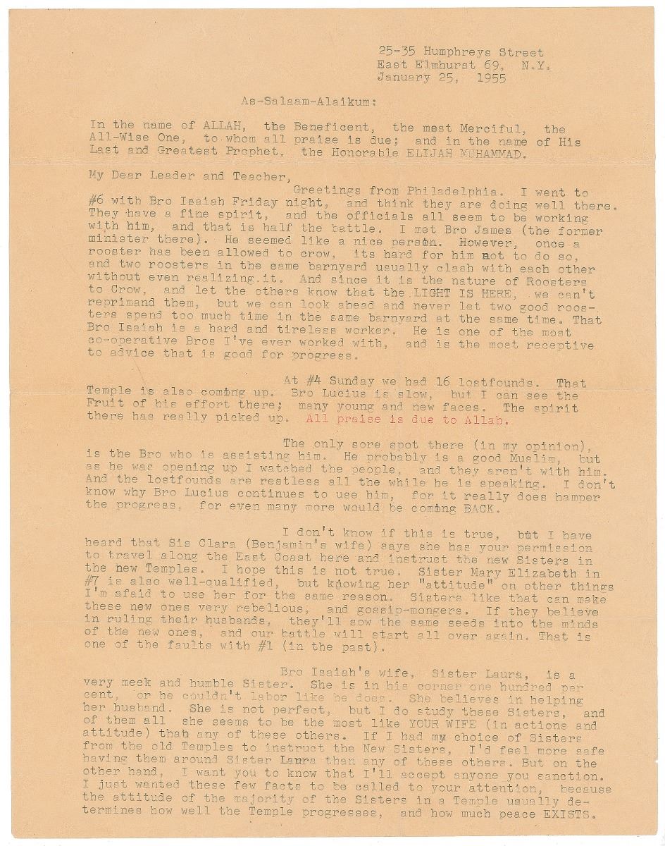 TLS, two pages, 8.5 x 11, January 25, 1955. Fascinating letter to his famous teacher, Elijah Muhammad, discussing the progress of spreading their beliefs, in part: “As—Salaam—Alaikum: In the name of ALLAH, the Beneficent, the most Merciful, the All-Wise One, to whom all praise is due: and in the name of His Last and Greatest Prophet, the Honorable ELIJAH MUHAMMAD…I went to #6 with Bro Isaiah Friday night, and think they are doing well there. They have a fine spirit, and the officials all seem to be working with him, and that is half the battle. I met Bro James (the former minister there). He seemed like a nice person. However, once a rooster has been allowed to crow, its hard for him not to do so, and two roosters in the same barnyard usually clash with each other without even realizing it. And since it is the nature of Roosters to Crow, and let the others know that the LIGHT IS HERE, we can’t reprimand them, but we can look ahead and never let two good roosters spend too much time in the same barnyard at the same time. That Bro Isaiah is a hard and tireless worker. He is one of the most co-operative Bros I’ve ever worked with, and is the most receptive to advice that is good for progress.