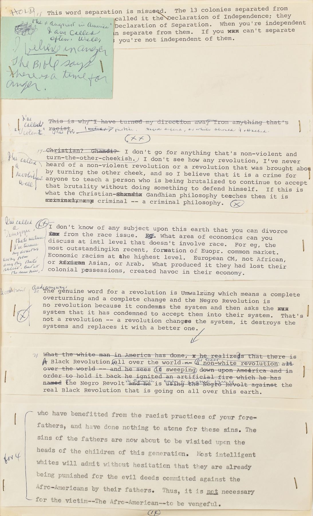 Handwritten note by Malcolm X, "I believe in anger, The Bible says there is a time for anger" preceded by Alex Haley's writing, "The 'angriest in America' I am called often. Well," on a light blue 3 x 2 slip, plus a series of seven segments of typescripts for the 'El Haji Shabazz' chapter of The Autobiography of Malcolm X annotated by Haley, stapled to a larger 8.5 x 13.75 sheet. Haley took information gleaned from interviews with Malcolm X and typed it up, then printed out pages of the draft and cut and pasted portions to keep and edit. Haley and Malcolm X then edited the draft together, sequencing these sections to produce an initial manuscript. This page is an example of that writing process used for the 'El Haji Shabazz' chapter. Nicely double-matted with a caption and portraits of both to an overall size of 18 x 24. In fine condition.
