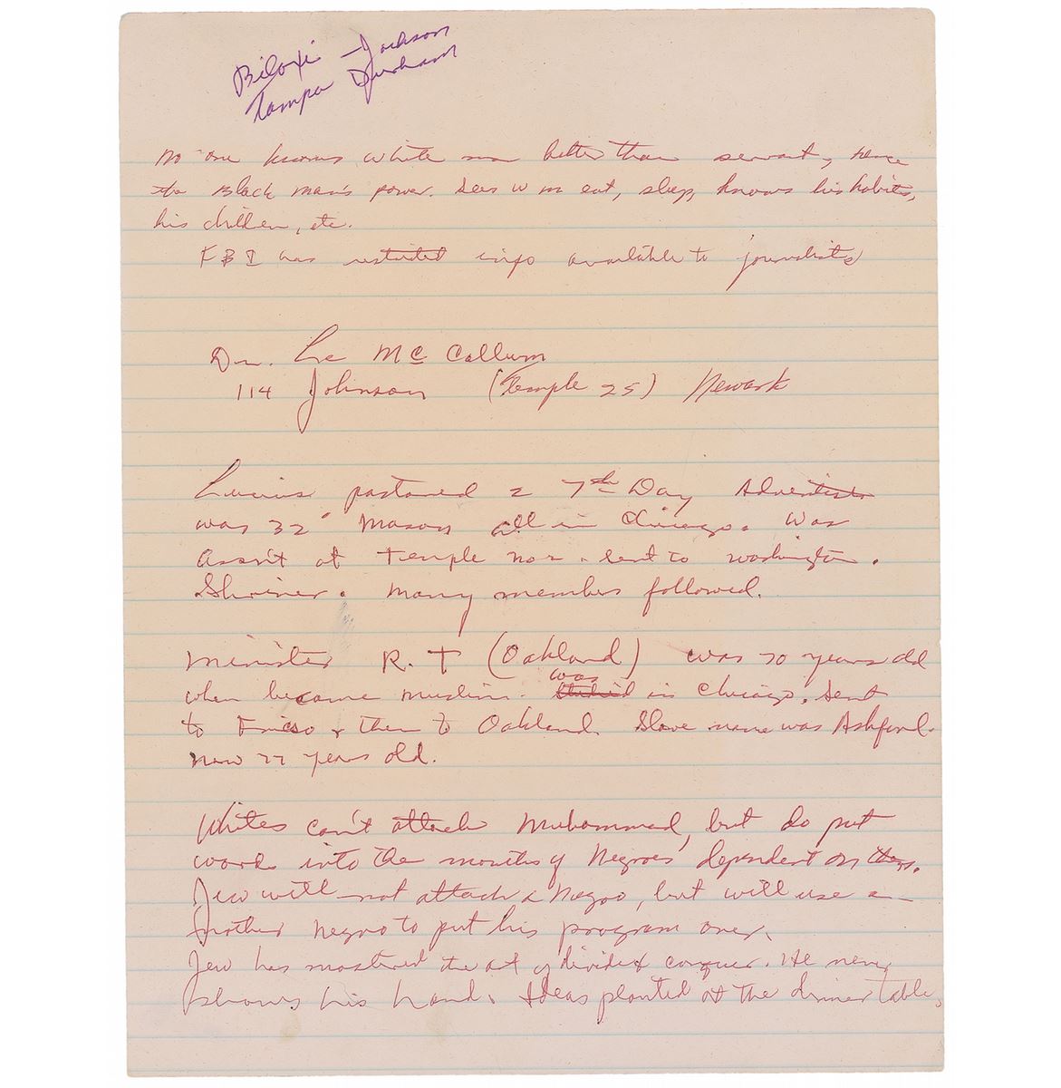 Handwritten manuscript, one page, 8.5 x 11, no date but circa 1960s. A page of Malcolm X’s handwritten notes in red ballpoint, possibly for one of his charismatic speeches. In part: “No one knows white man better than servant, there the Black Man’s powers. Sees w[hite] m[en] eat, sleep, knows his habits, his children, etc…Minister R. T. (Oakland) was 70 years old when he became Muslim. Was in Chicago…Slave name was Ashford. Now 77 years old. White’s can’t attack Muhammad, but do put words into the mouths of Negroes dependent on them. Jew will not attack a Negro, but will use another Negro to put his program over. Jew has mastered the art of divide and conquer. He never shows his hand. Ideas planted at the dinner table.” In fine condition, with a few creases. The ideas penned here echo those he frequently brought up in interviews and speeches, often reiterating the idea that 'the servant sees that master, but the master doesn't see the servant.' He also spoke of the strategy of 'divide and conquer,' as did Elijah Muhammad, but often in broader terms describing either the 'white man' or colonialism in general. Despite its brevity, these notes touch upon several of the most important concepts associated with Malcolm X—race relations, conversion and the rejection of the "slave name," Muhammad, and institutionalized racism.